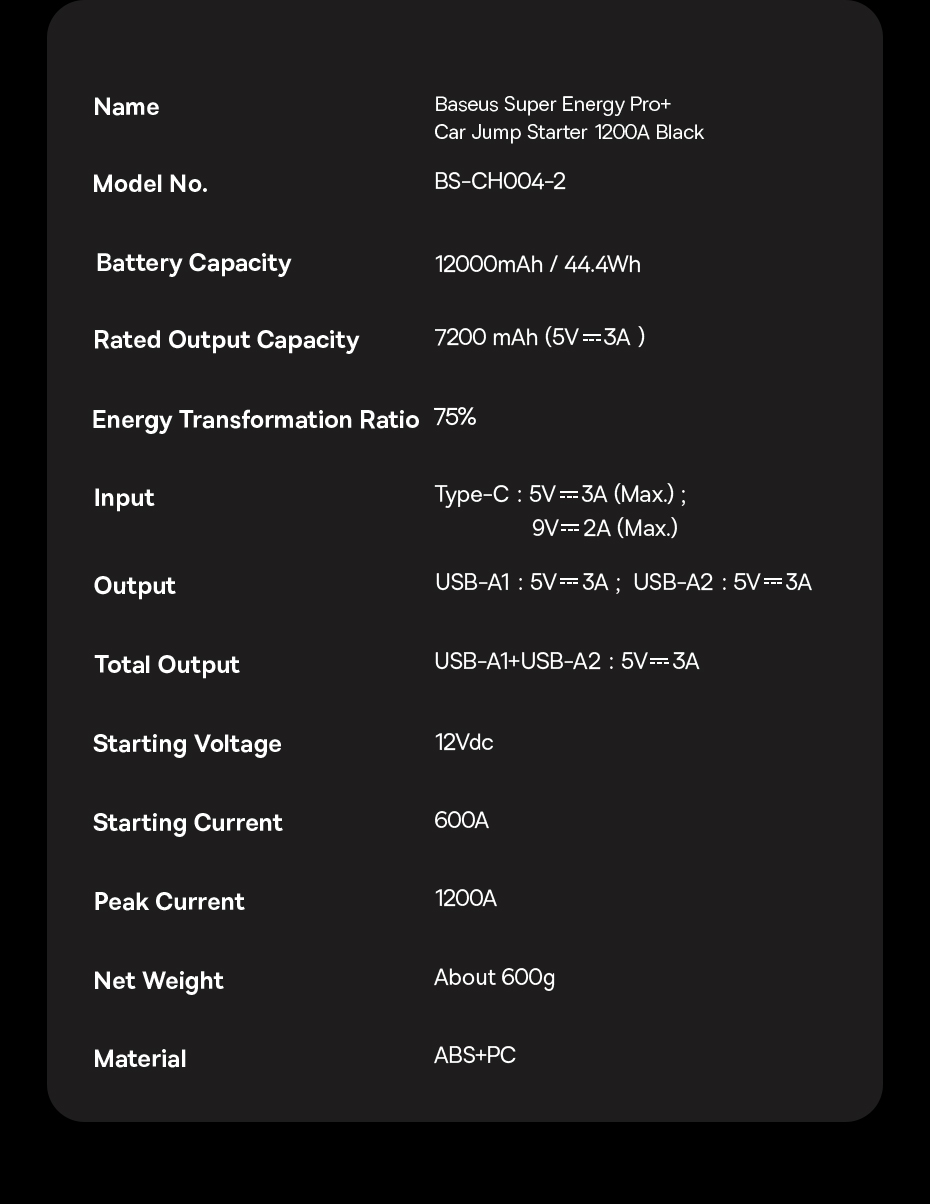 | Tên | Bộ kích bình dùng cho xe hơi Baseus Super Energy Pro+ 1200A Car Jump Starter |