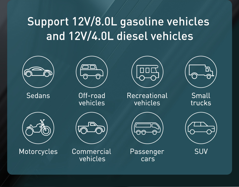 Hỗ trợ xe máy dầu: Dung tích động cơ lên đến 4.0L. Dễ dàng kích nổ cho hầu hết các loại phương tiện từ xe con (Sedan, SUV), xe bán tải, đến xe tải nhỏ và xe công trình sử dụng bình 12V.