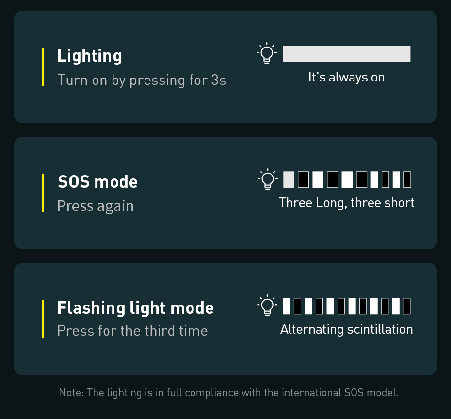 Đèn pin tích hợp 3 chế độ (Sáng thường/SOS/Nhấp nháy) cực tiện lợi khi sửa xe ban đêm hoặc phát tín hiệu cầu cứu.