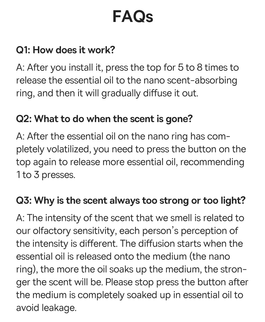 ✨ ĐIỀU CHỈNH HƯƠNG THƠM THEO Ý MUỐN: Toàn quyền kiểm soát mức độ hương thơm trong xe của bạn. Chỉ cần nhấn nhẹ lên bề mặt của sản phẩm, bạn có thể dễ dàng điều chỉnh độ khuếch tán của hương thơm. Nhấn 1-2 lần cho hương thơm nhẹ nhàng, thoang thoảng; nhấn 4-5 lần cho hương thơm đậm và mạnh mẽ hơn.