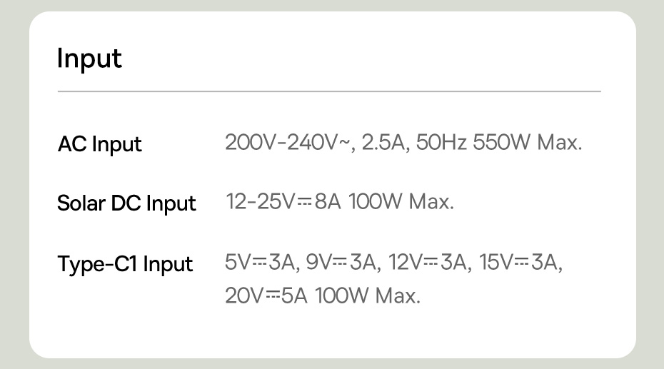 | Type-C1 Input | 5V-3A, 9V-3A, 12V-3A, 15V-3A, 20V-5A 100W |