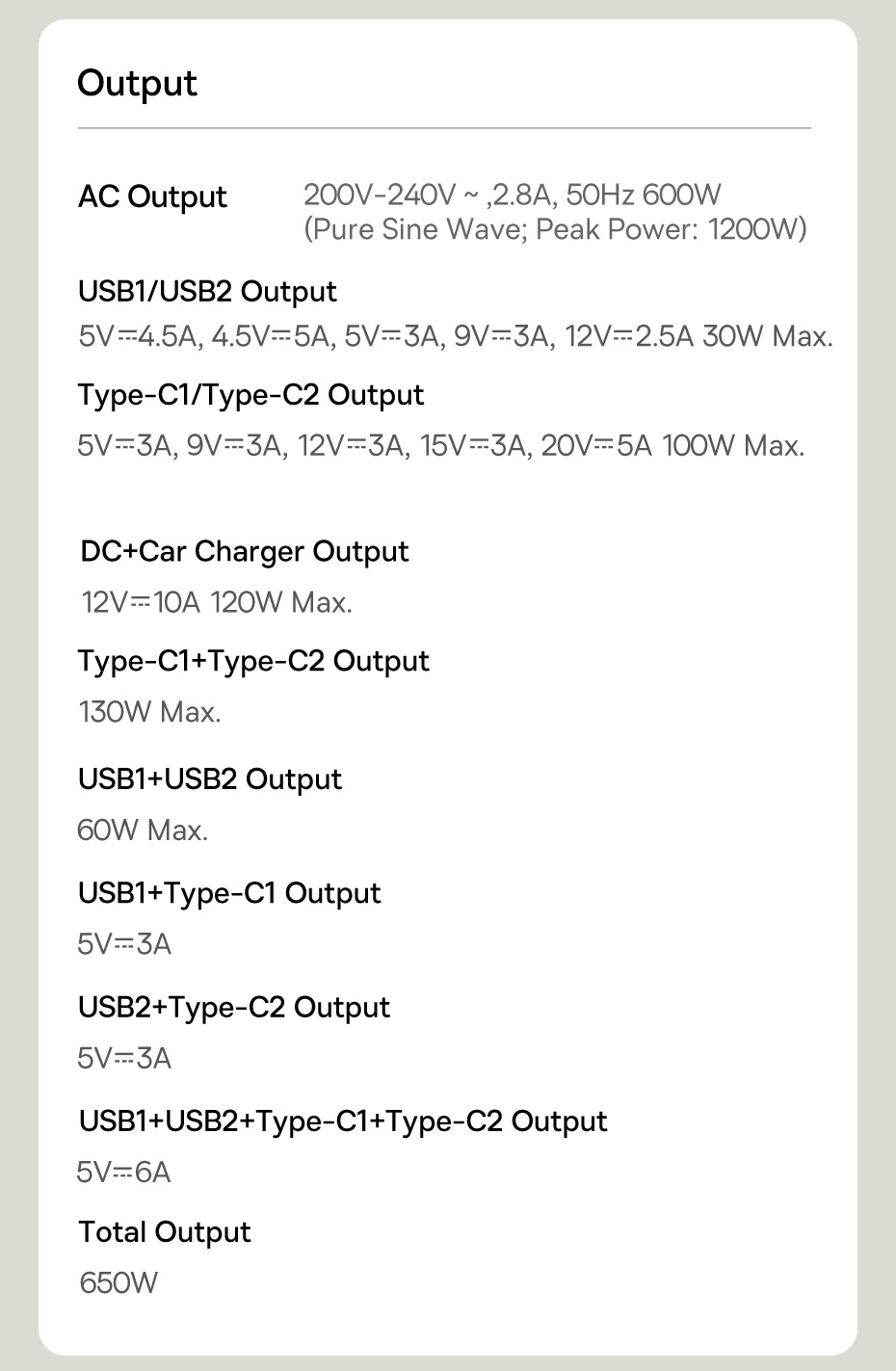 | Type-C1/Type-C2 Output | 5V-3A, 9V-3A, 12V-3A, 15V-3A, 20V-5A, 100W |