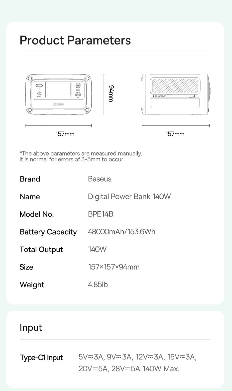 | Type-C1 Input | 5V-3A, 9V-3A, 12V-3A, 15V-3A, 20V-5A, 28V-5A 140W Max |