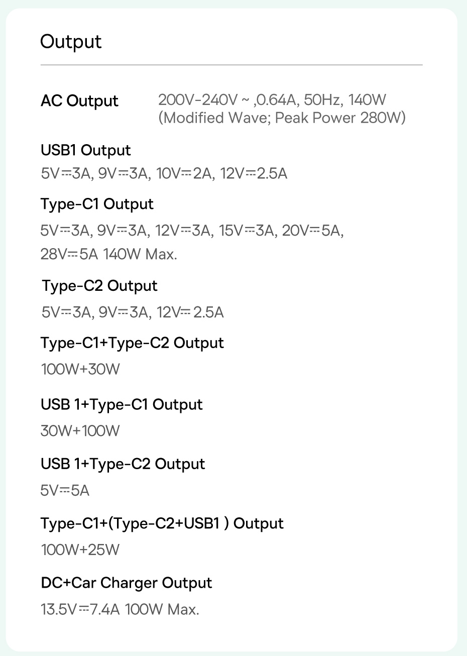| Type-C1 Output | 5V-3A, 9V-3A, 12V-3A, 15V-3A, 20V-5A, 28V-5A 140W |
