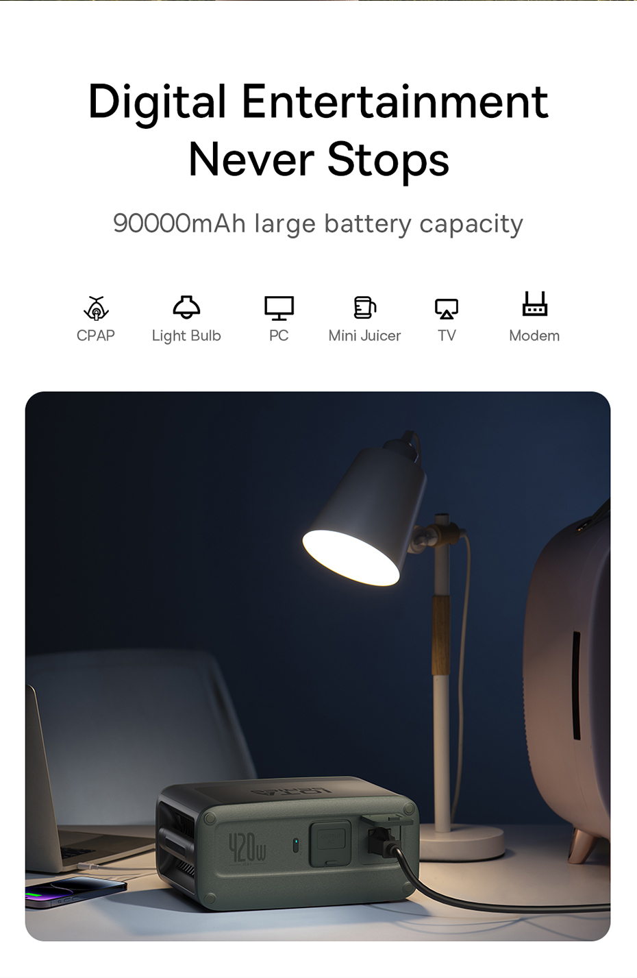 🏕️ CÔNG SUẤT 420W, DUNG LƯỢNG 90000MAH: Nguồn năng lượng dồi dào cho mọi nhu cầu. Dễ dàng cấp nguồn cho các thiết bị như tủ lạnh mini, quạt, máy pha cà phê, laptop, drone... trong nhiều giờ liền, đảm bảo chuyến đi của bạn luôn tiện nghi và không bị gián đoạn.