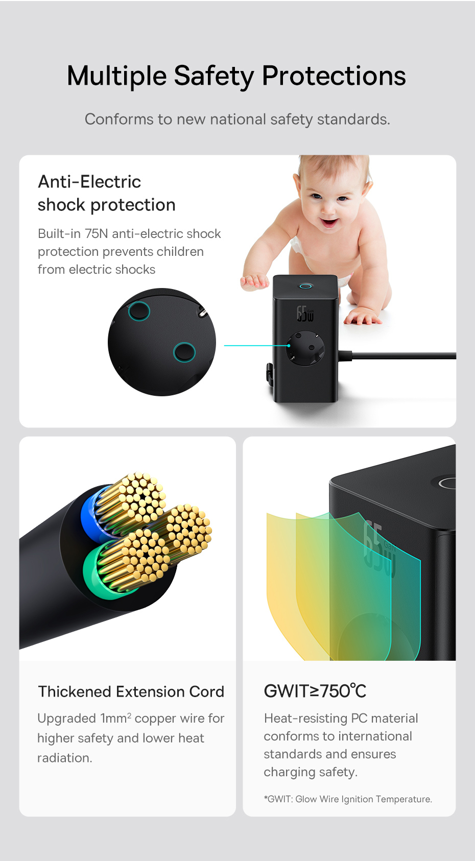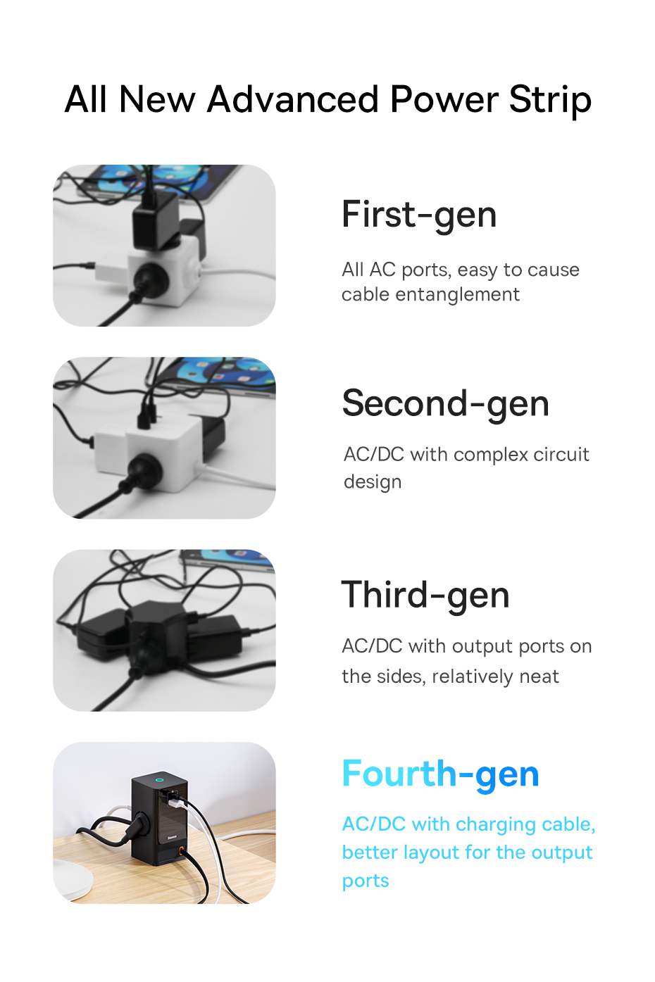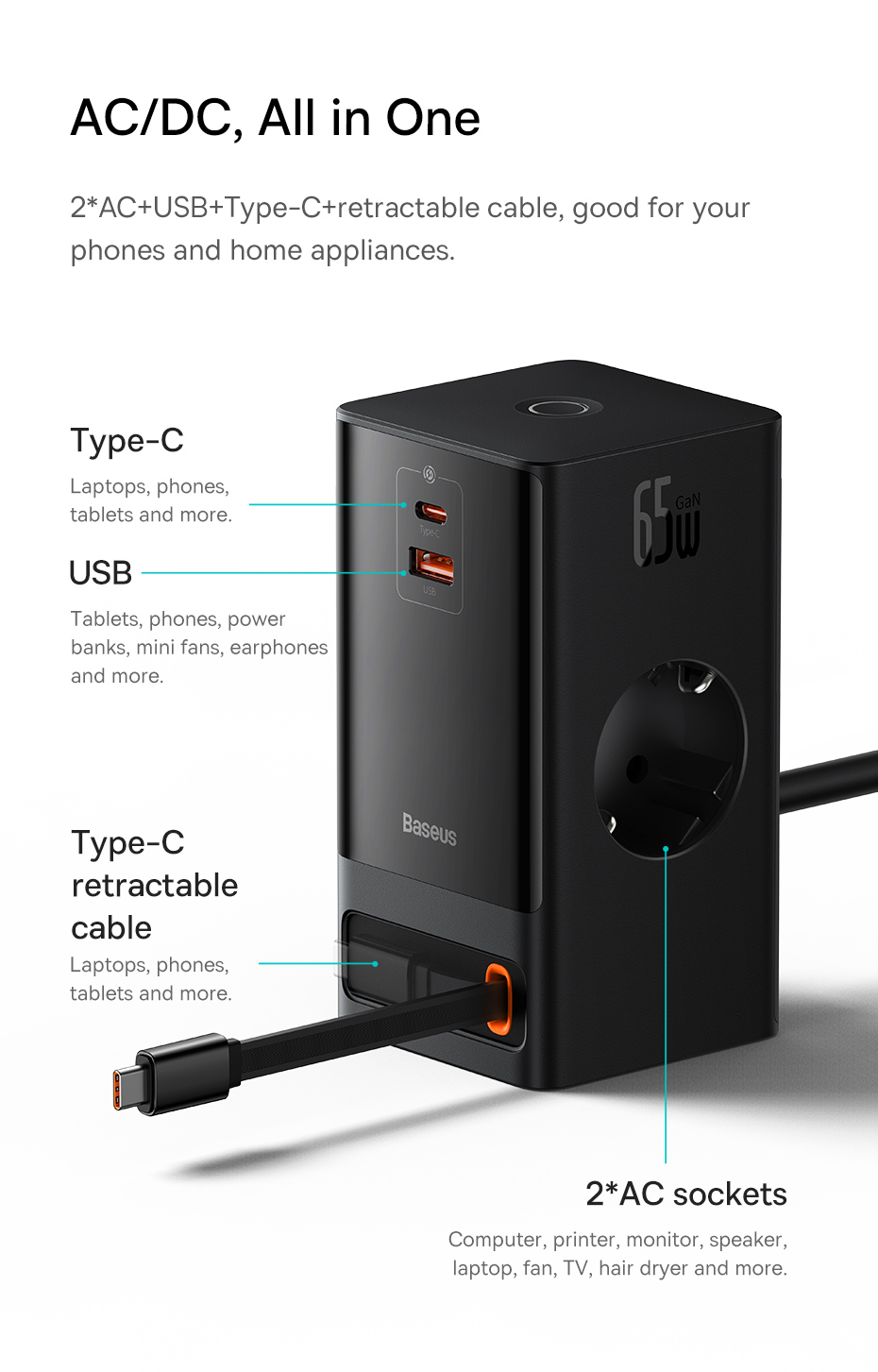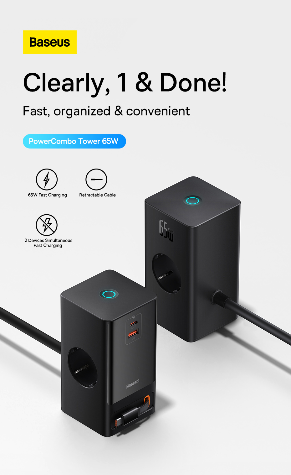 Bạn mệt mỏi với ổ cắm truyền thống và một mớ củ sạc lộn xộn? Baseus PowerCombo 65W là trạm sạc tối thượng, giải phóng không gian. Sản phẩm kết hợp 2 ổ cắm AC và 3 cổng sạc nhanh GaN (tổng 65W) bao gồm: 1 cổng Type-C, 1 cổng USB và 1 cáp Type-C rút gọn tích hợp.