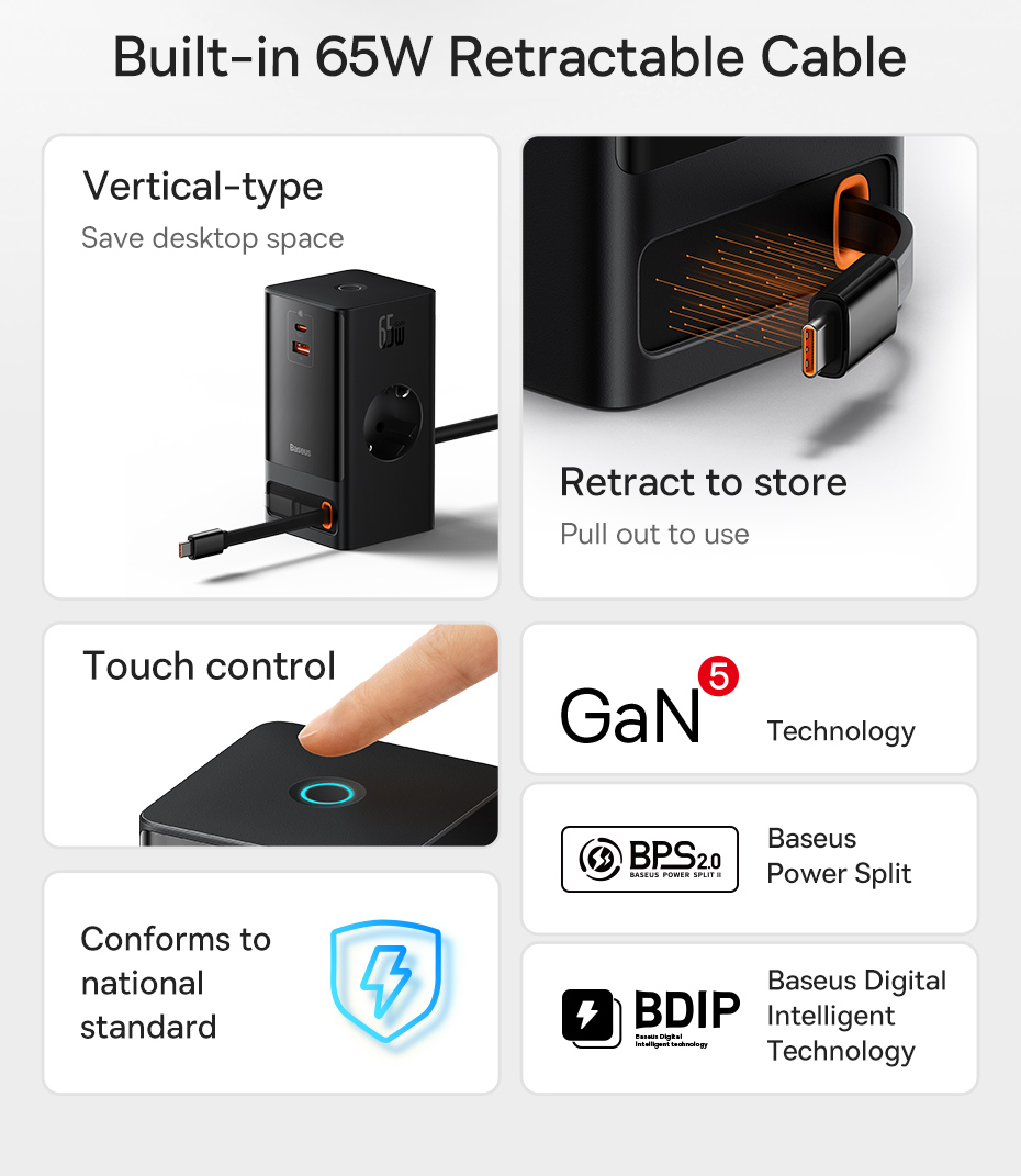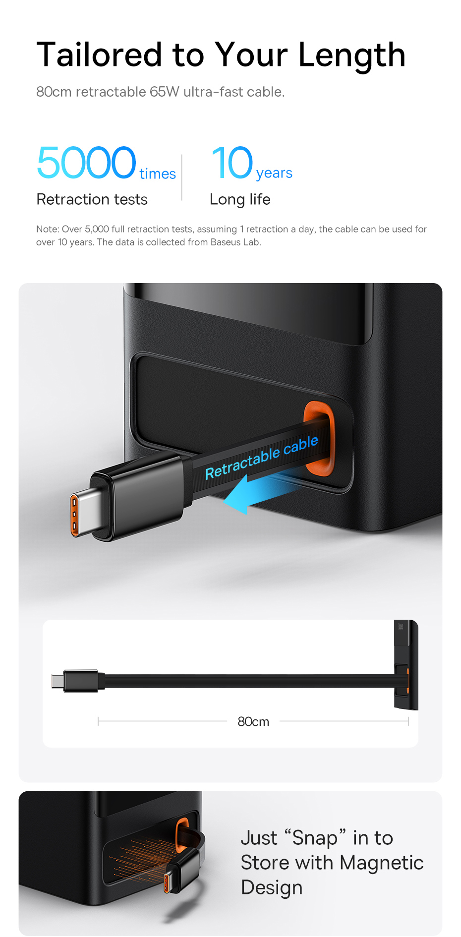 🔄 CÁP TYPE-C 65W RÚT GỌN TÍCH HỢP: Không cần mang thêm cáp! Trạm sạc tích hợp sẵn 1 sợi cáp Type-C hỗ trợ sạc nhanh PD 65W, có thể kéo ra và tự động thu gọn.