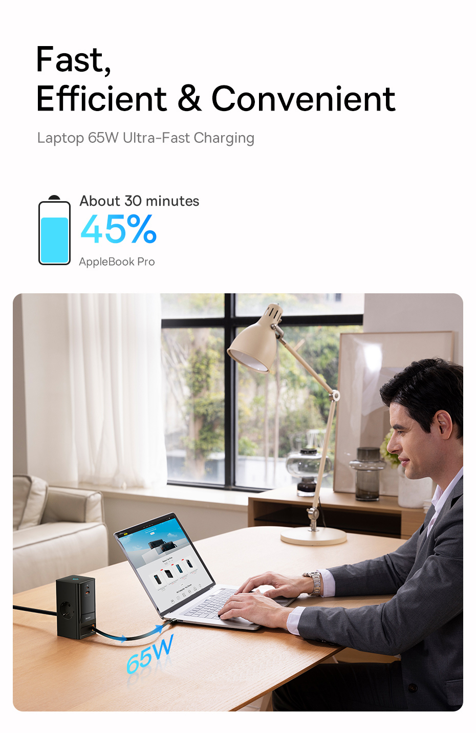 💻 SẠC NHANH 65W (LAPTOP & ĐIỆN THOẠI): Công nghệ GaN 65W sạc nhanh cho laptop (45% pin trong 30 phút, theo ảnh), trong khi các cổng khác sạc cho điện thoại, máy tính bảng.