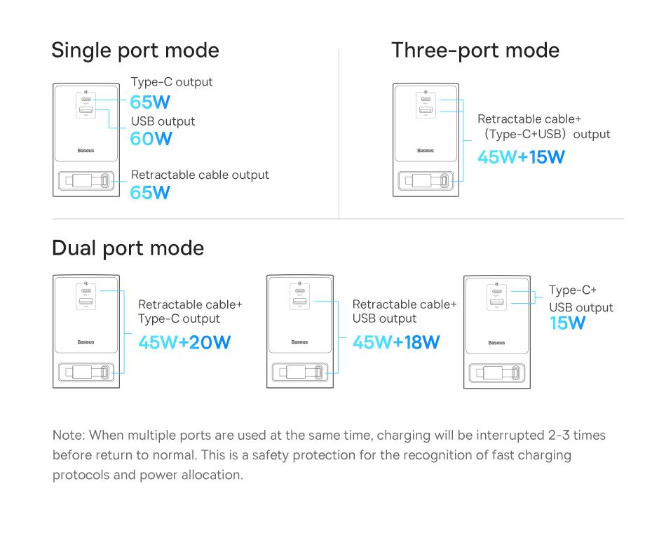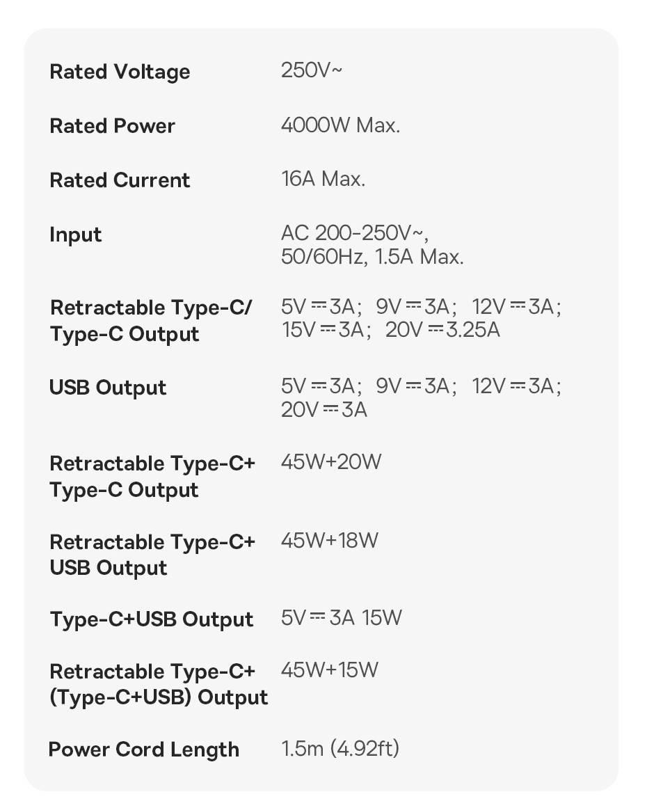 | Retractable-C / Type-C Output | 5V-3A, 9V-3A, 12V-3A, 15V-3A, 20V-3.25A |