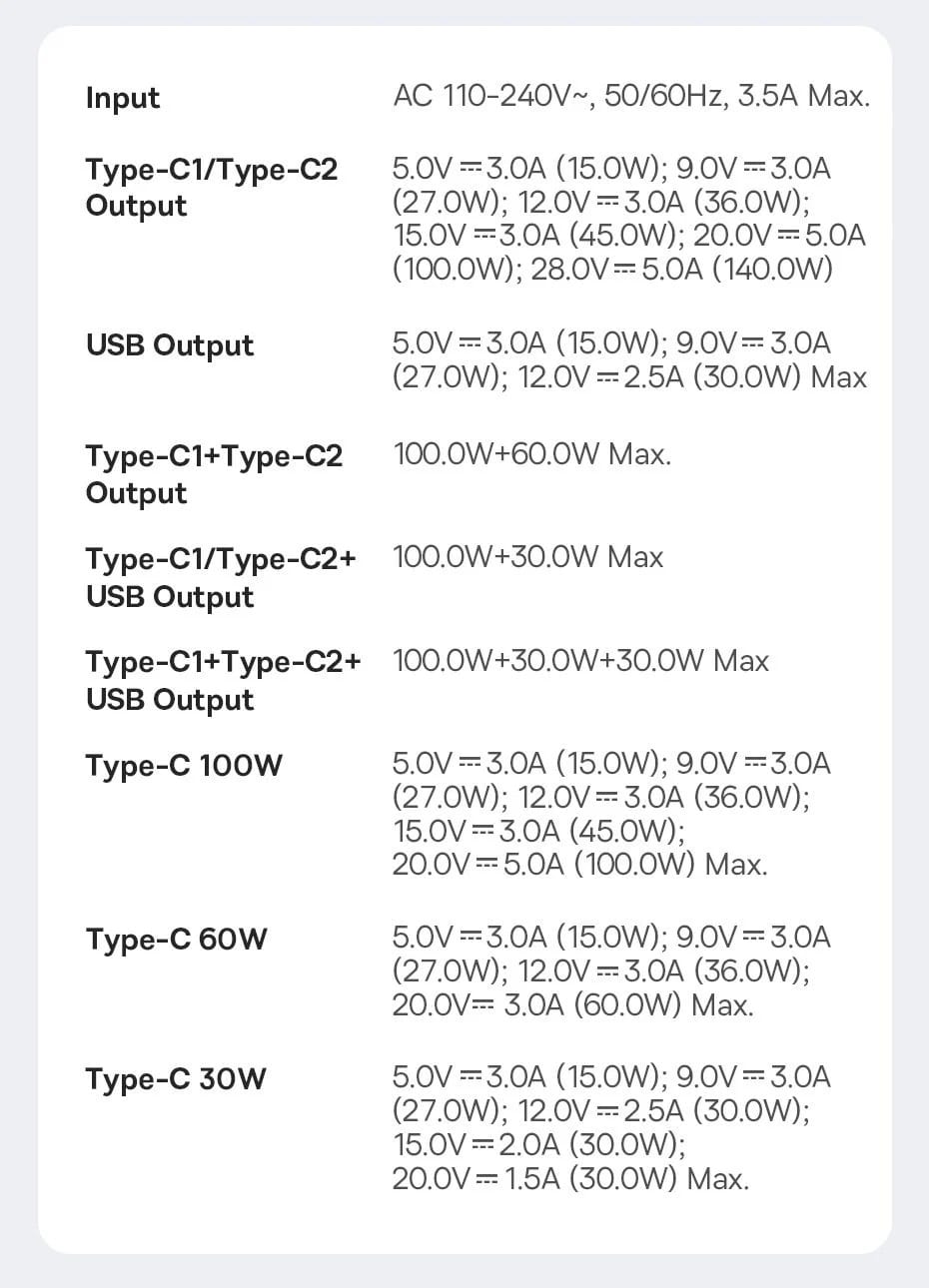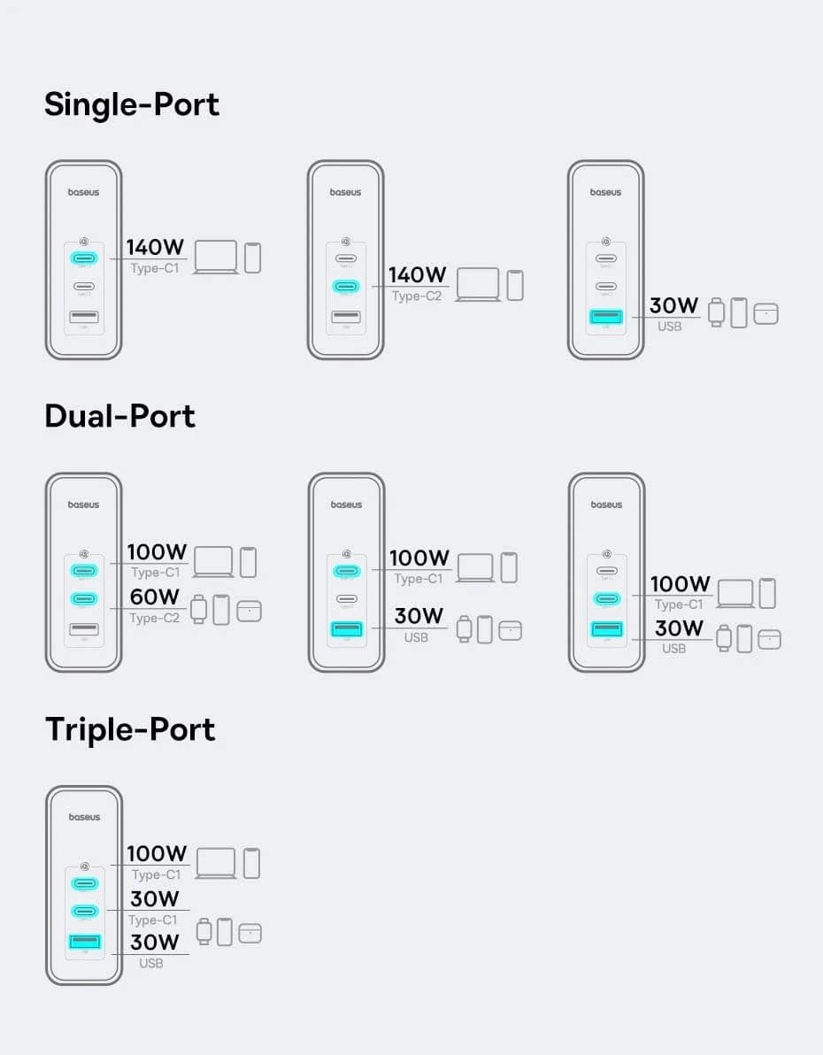 Công suất sạc đơn cổng 140W: Hỗ trợ chuẩn sạc PD3.1 mới nhất, sạc được cho cả các dòng laptop đồ họa, gaming cấu hình cao.