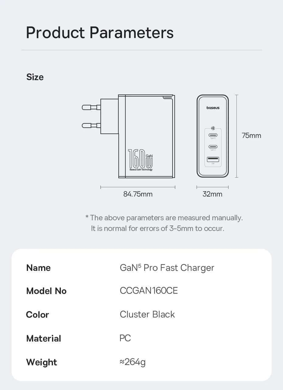 | Tên | Bộ Sạc Nhanh Baseus GaN5 Pro Digital Fast Charger 2C+U 160W CN (Kèm cáp C to C 240W, 48V/5A, 1m) |