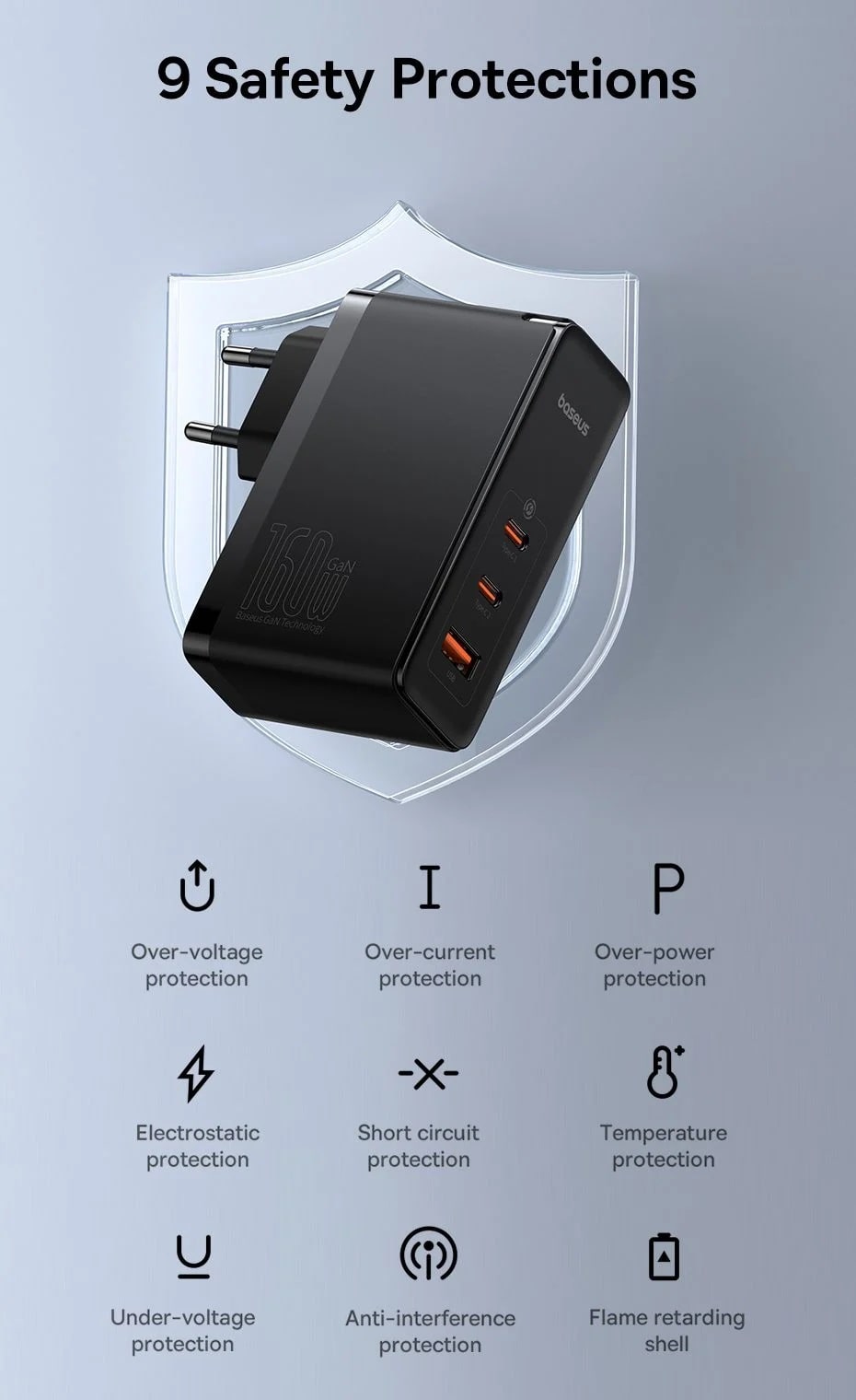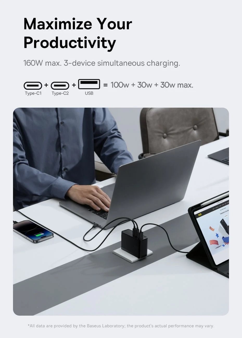 Tổng công suất 160W: Cho phép sạc nhanh nhiều thiết bị công suất lớn cùng lúc.