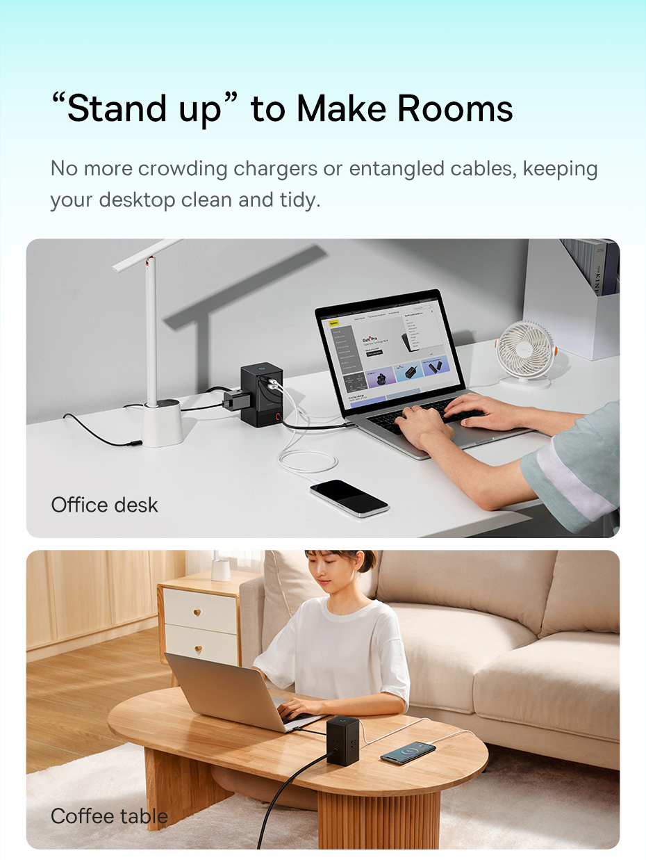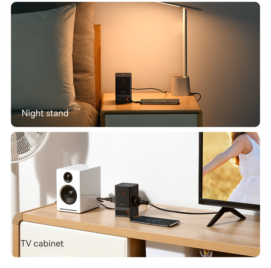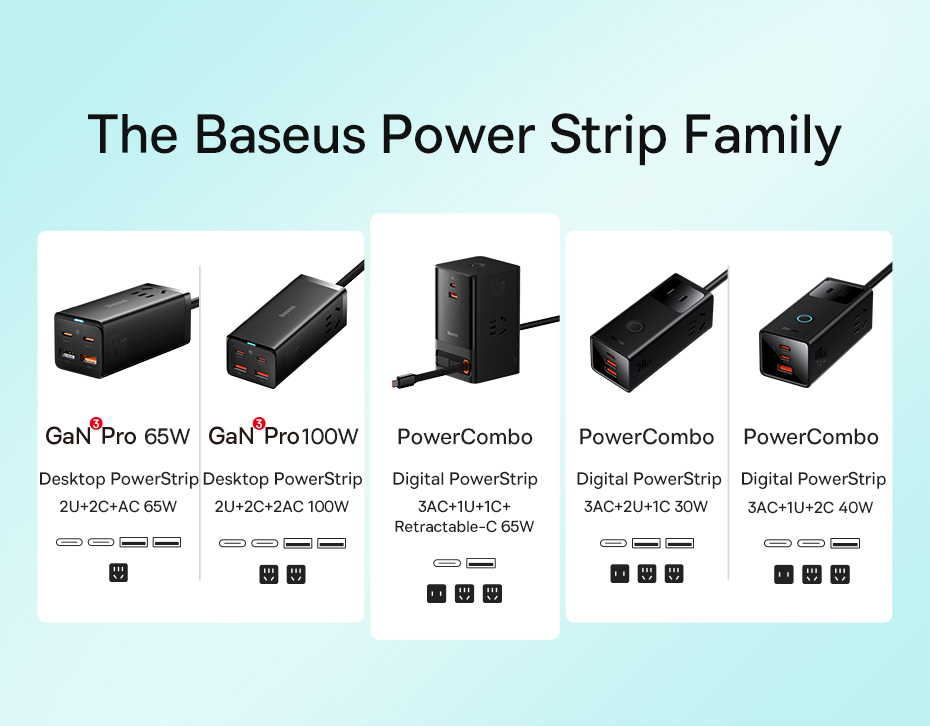 Với việc tích hợp dây dẫn nguồn AC nối dài kèm theo 3 ổ cắm điện AC, Baseus PowerCombo Digital Powerstrip không chỉ là một củ sạc đa năng mà nó còn được sử dụng như một ổ cắm điện thông minh, đáp ứng mọi nhu cầu và không gian làm việc của bạn. Chỉ với Baseus PowerCombo Digital PowerStrip có thể đảm bảo cấp nguồn cho tất cả các thiết bị của bạn từ AC đến DC.