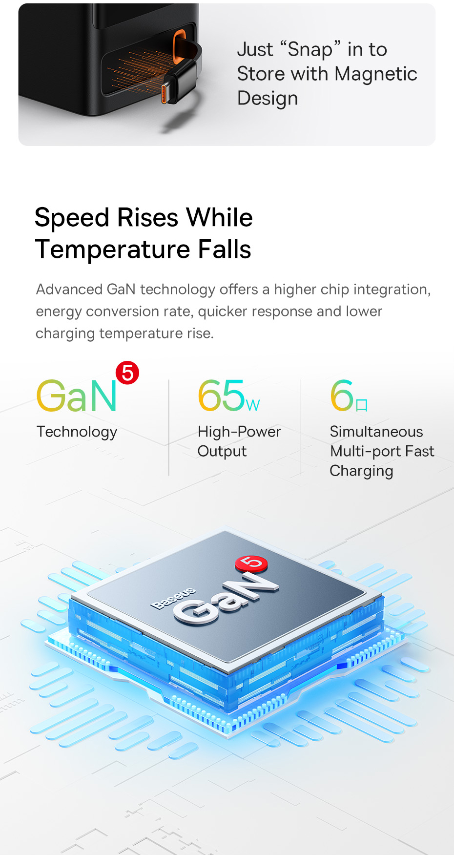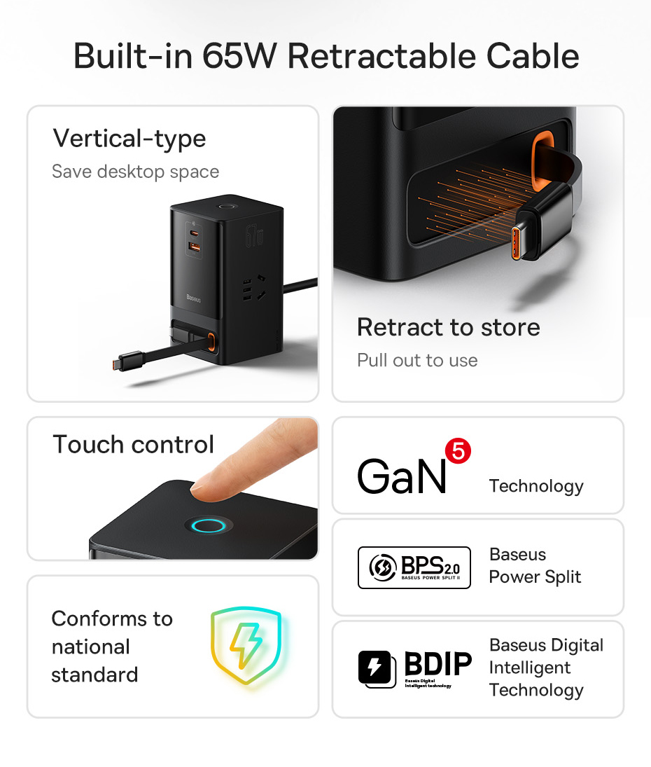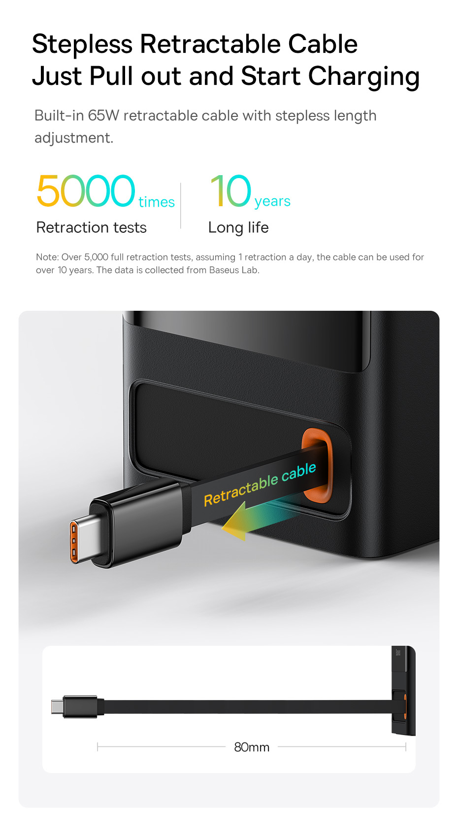Tích hợp sẵn bên trong một sợi cáp sạc siêu nhanh 65W có thể kéo ra với độ dài tối đa 80mm, rút lại vô cần tiện lợi với độ bền lên tới 5000 lần kéo, tuổi thọ 10 năm.