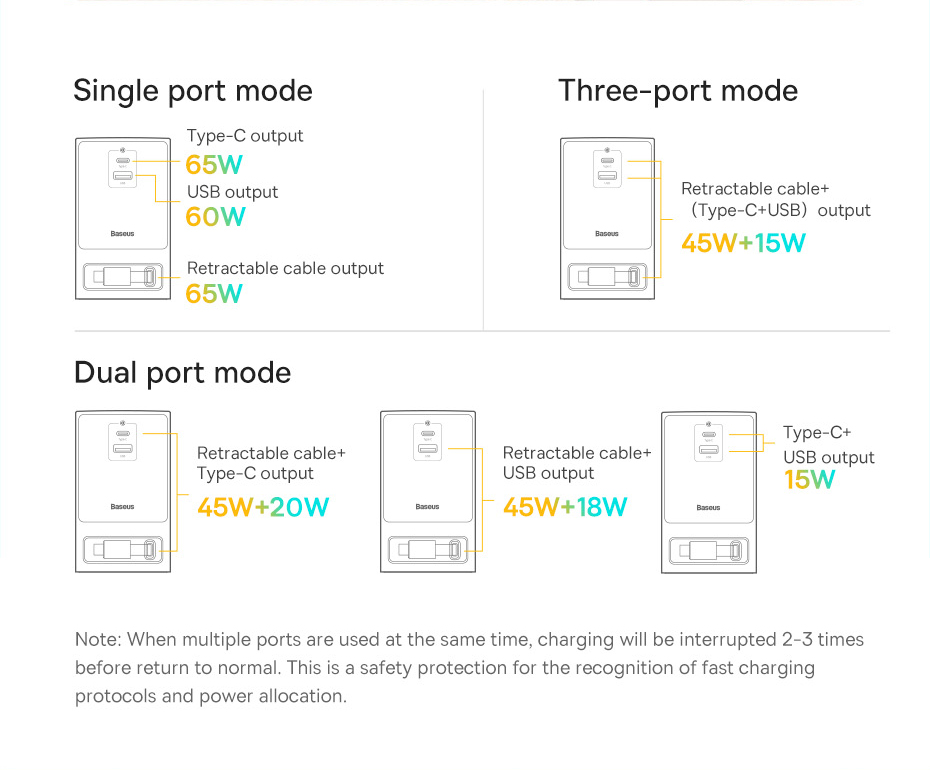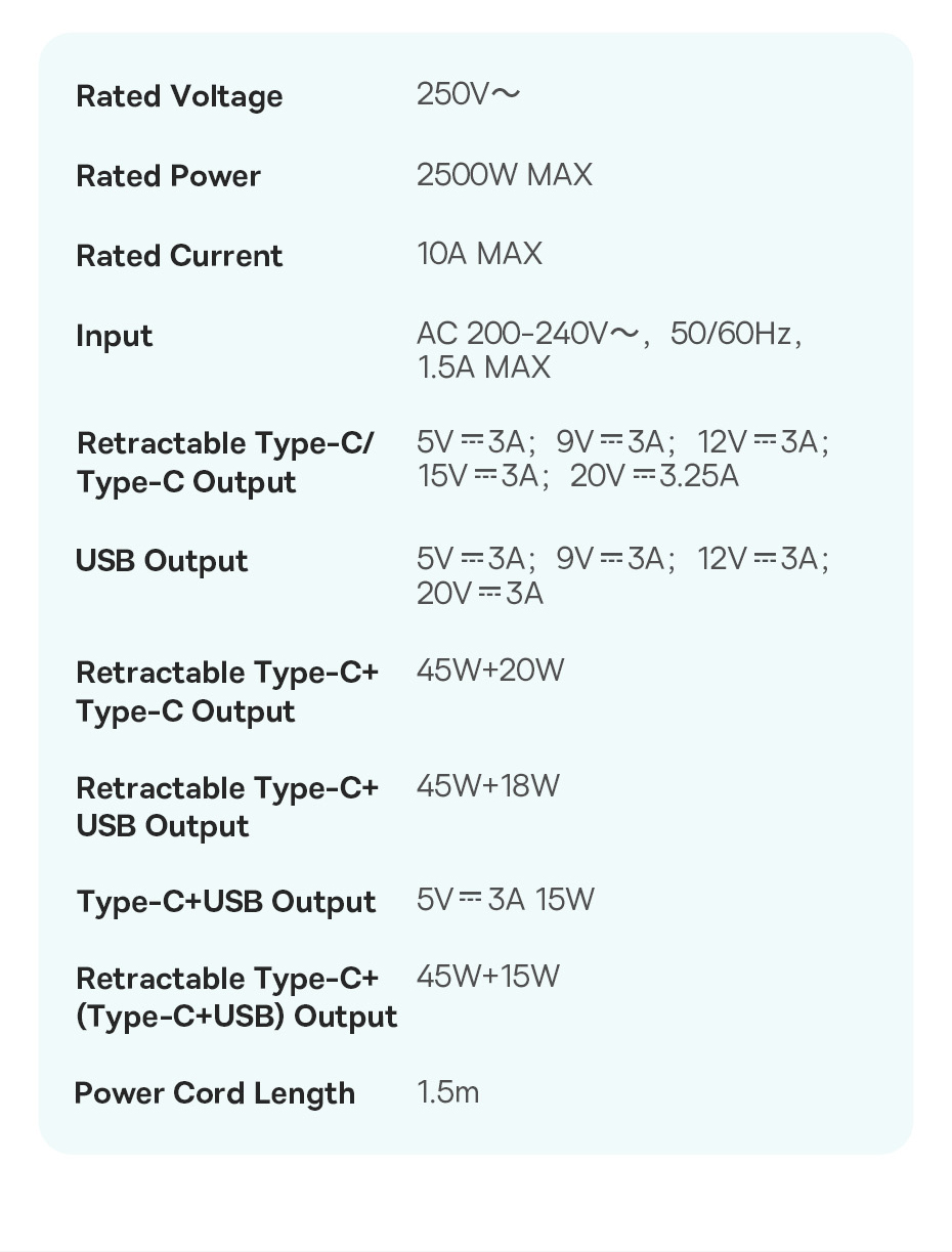 | Retractable Type-C + Type-C Output | 45W + 20W |