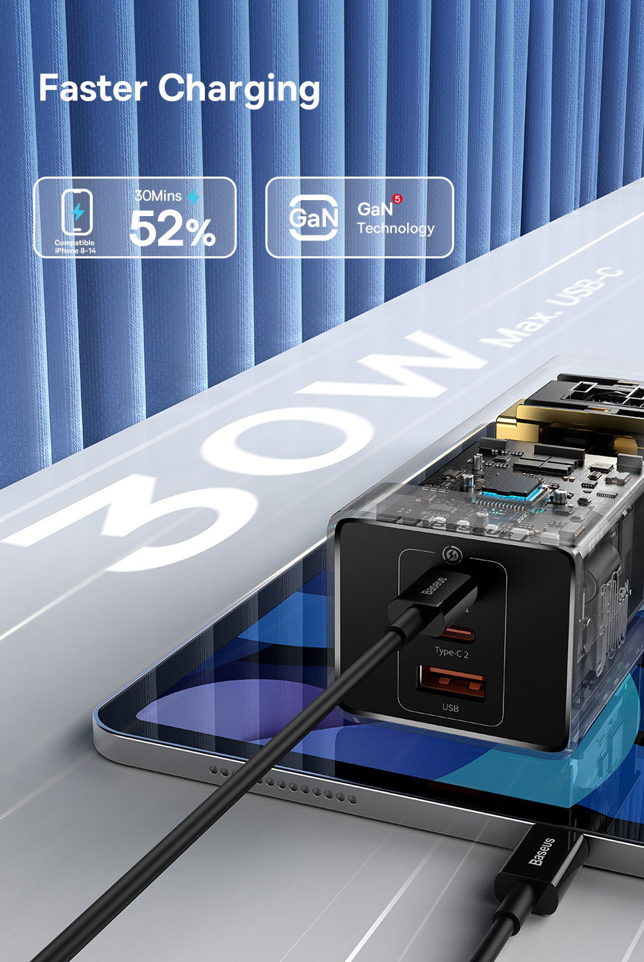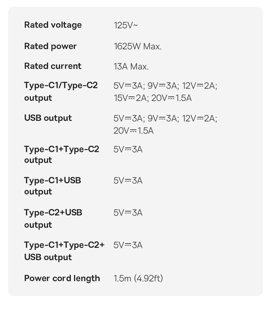| Type-C1 / Type-C2 Output | 20W: 5V-3A, 9V-2.22A, 12V-1.67A 30W: 5V-3A, 9V-3A, 12V-2A, 15V-2A, 20V-1.5A |
