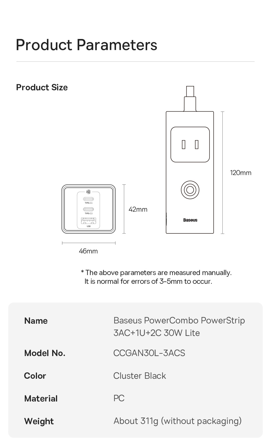 | Tên | Bộ Sạc Nhanh Baseus PowerCombo PowerStrip 3AC+1U+2C Lite (Chân cắm US, dây dài 1.5m) |