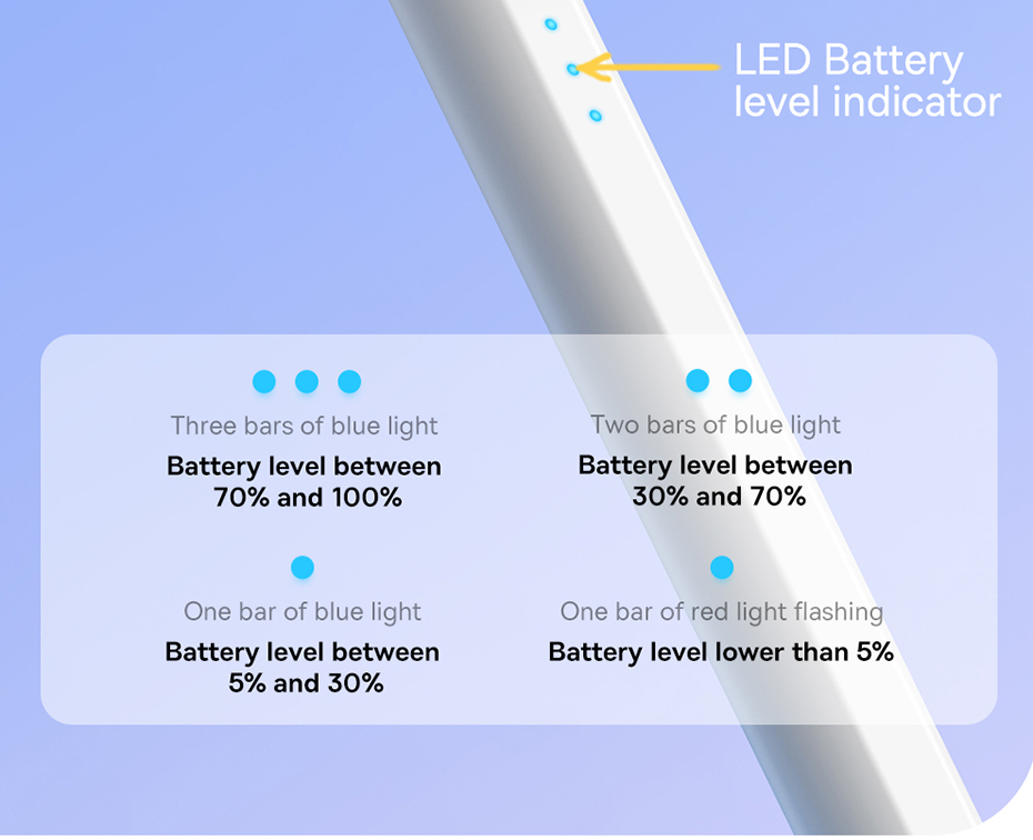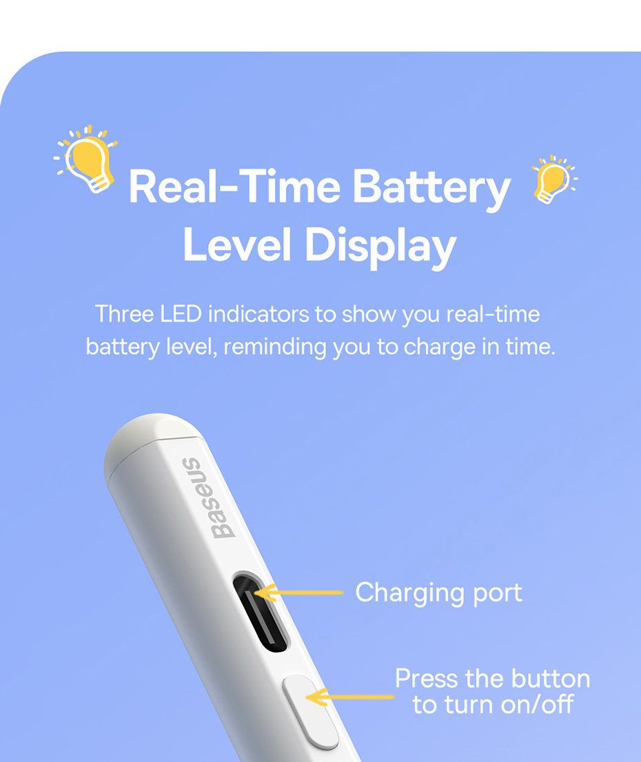 Sản phẩm thường đi kèm với đèn LED chỉ báo, giúp bạn biết khi nào bút đang được sạc hoặc đã được sạc đầy. Điều này giúp bạn duy trì sự hoạt động của bút một cách tiện lợi và không bị hết pin.
