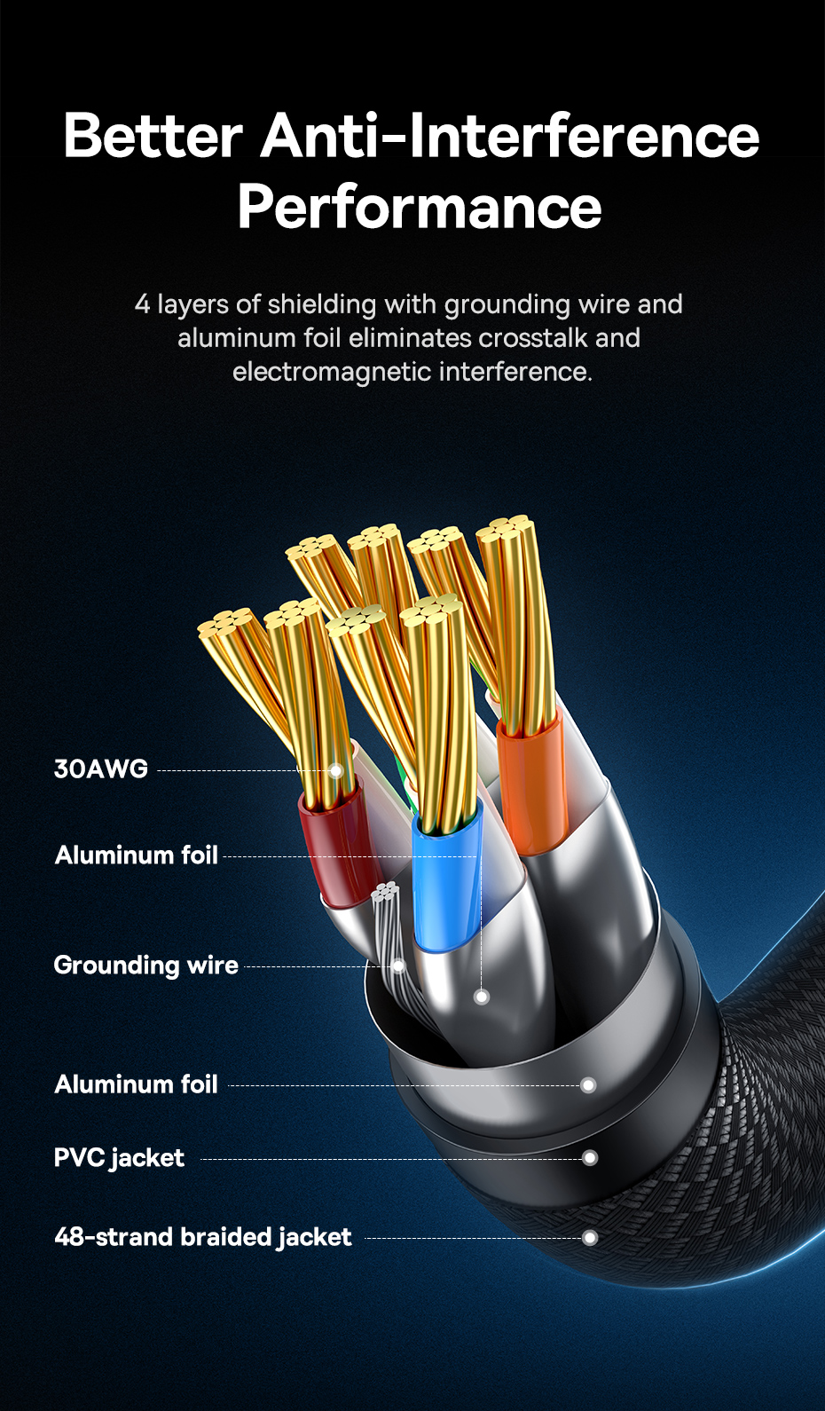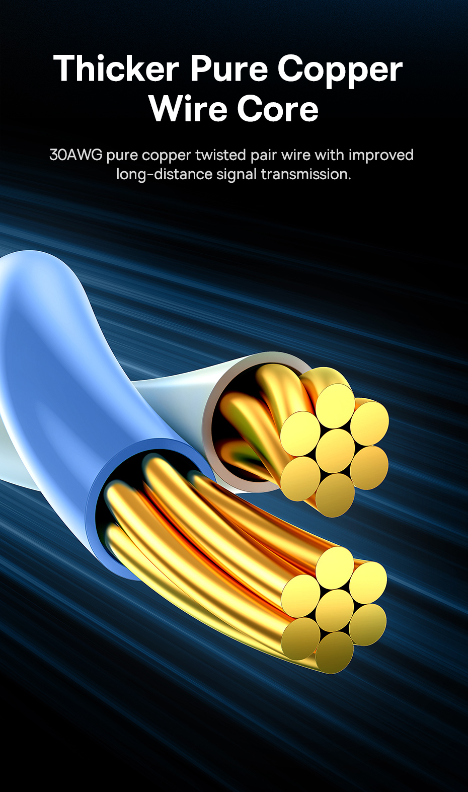 Lõi đồng nguyên chất 30AWG: Cho khả năng truyền dẫn tín hiệu tốt nhất.