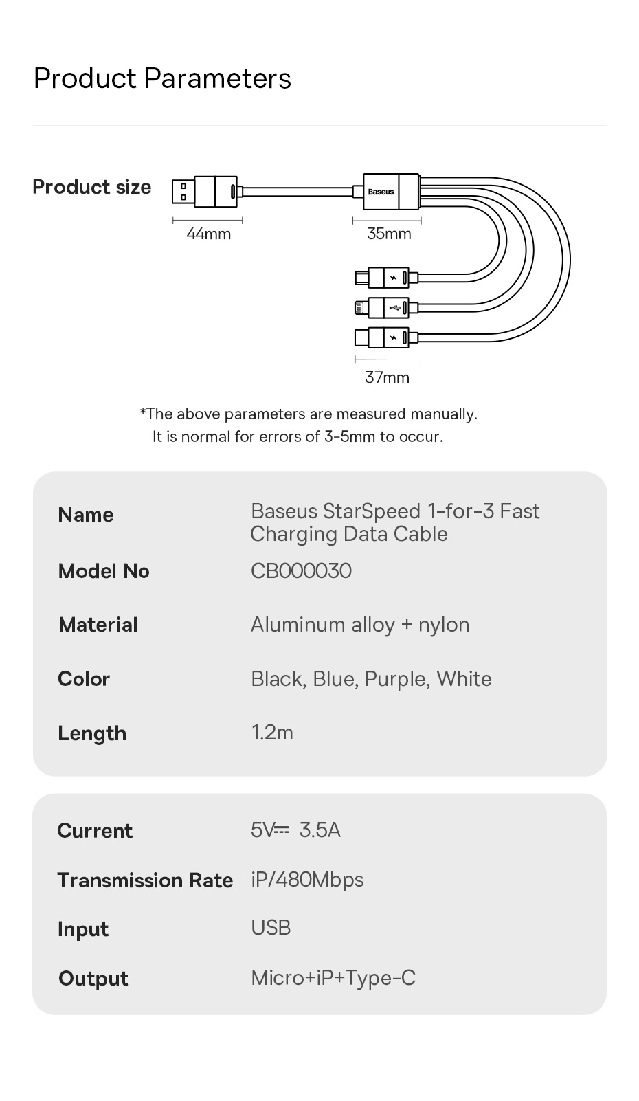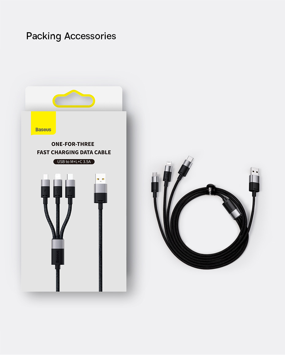 | Tên | Cáp Sạc 3 Đầu Baseus StarSpeed 1-for-3 Fast Charging Data Cable USB to M+L+C 3.5A 0.6m |