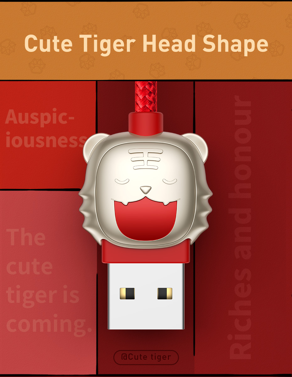 🐯 THIẾT KẾ ĐẦU HỔ ĐỘC ĐÁO: Không chỉ là một sợi cáp thông thường, đây còn là một phụ kiện thể hiện cá tính. Đầu cắm USB được tạo hình một chú hổ vàng cực kỳ ngộ nghĩnh và sang trọng, mang lại sự may mắn và một điểm nhấn vui nhộn cho góc sạc của bạn.