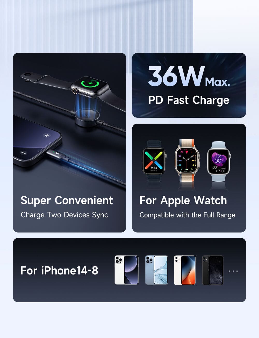 📱+⌚️ Sạc Đồng Thời Điện Thoại & AppleWatch: Thiết kế thông minh cho phép bạn sạc cùng lúc cả điện thoại và AppleWatch từ một củ sạc duy nhất. Dọn dẹp không gian bàn làm việc, tủ đầu giường và tối giản hành lý du lịch của bạn.