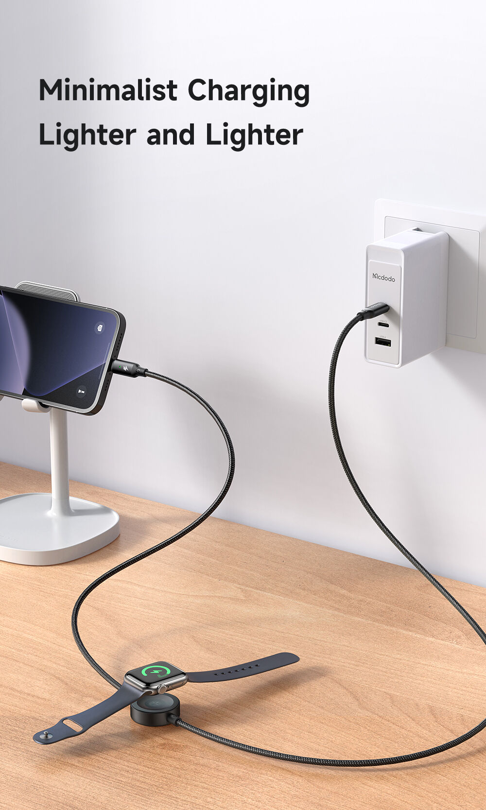 Bạn mệt mỏi vì sự lộn xộn của hai sợi cáp riêng biệt cho điện thoại và AppleWatch? Cáp sạc Mcdodo 2 trong 1 là giải pháp hoàn hảo, tích hợp cả đầu sạc cho điện thoại và đế sạc từ tính cho AppleWatch trên cùng một sợi cáp, giúp bạn tối giản phụ kiện một cách hiệu quả.