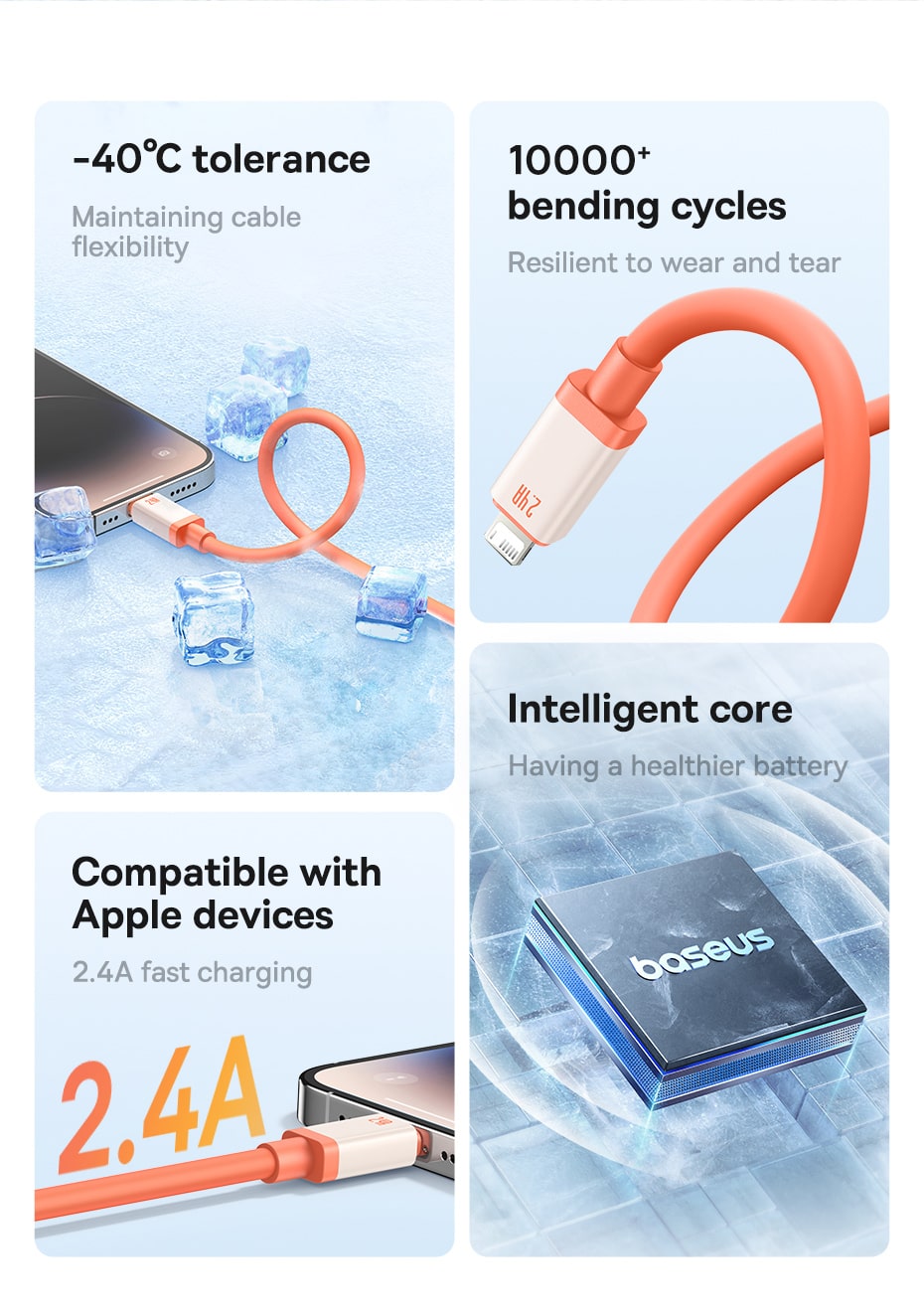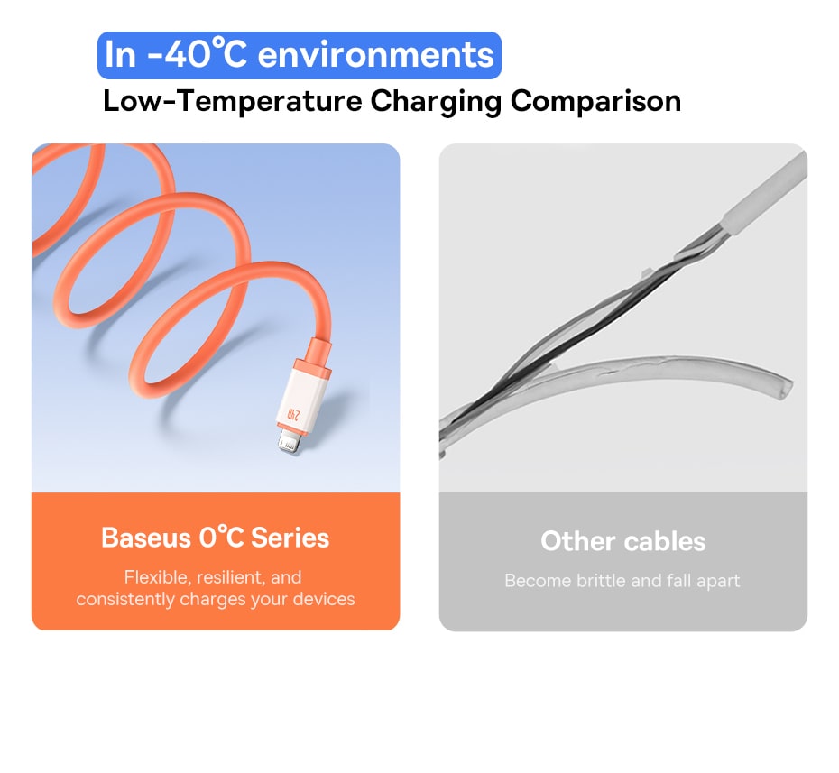 Bạn mệt mỏi với những sợi cáp nhựa thông thường trở nên cứng và giòn gãy theo thời gian? Baseus 0℃ Series được chế tạo với vật liệu TPE cao cấp, mang lại sự dẻo dai không tưởng và độ bền vượt trội để hoạt động ổn định trong mọi điều kiện.