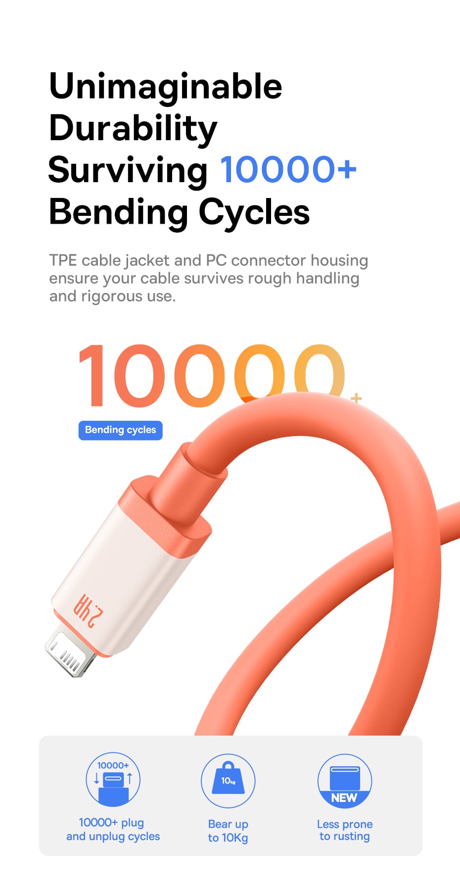 💪 Siêu Dẻo Dai, Bền Bỉ Vượt Trội: Trải nghiệm độ bền đỉnh cao với vỏ cáp TPE cao cấp, đã vượt qua hơn 10,000 lần thử nghiệm uốn cong. Cấu trúc dẻo dai giúp chống gãy gập hiệu quả, đặc biệt là ở phần cổ cáp, đảm bảo tuổi thọ sử dụng lâu dài.