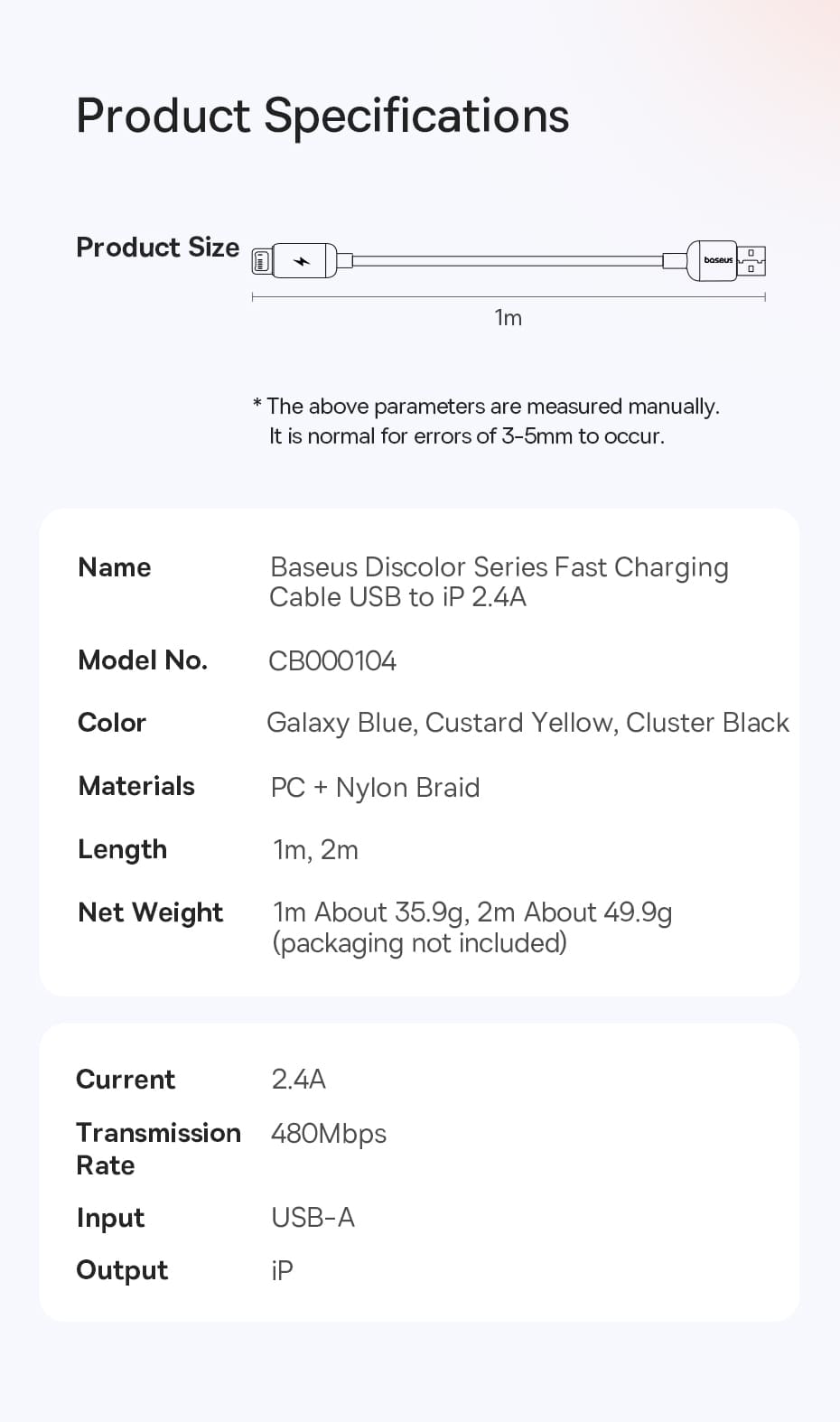 | Tên | Cáp Sạc Nhanh Baseus Discolor Series Fast Charging Cable USB to iP 2.4A |