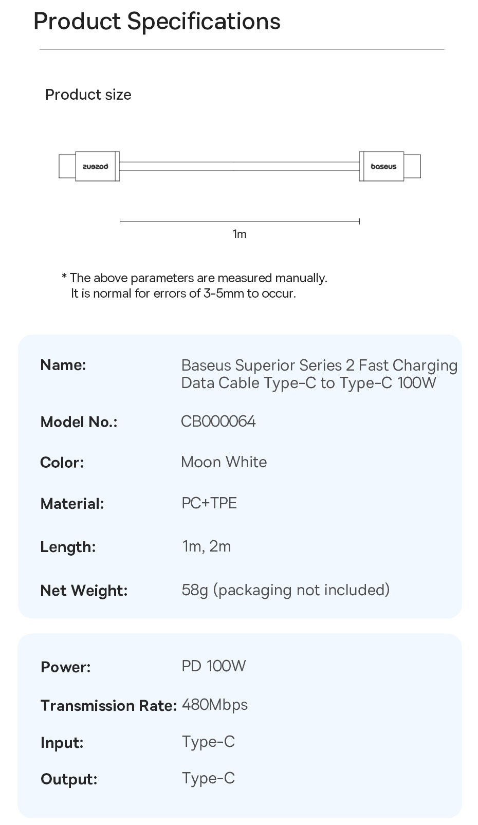 | Tên | Cáp Sạc Nhanh Baseus Superior Series 2 Fast Charging Data Cable Type-C to Type-C 100W |