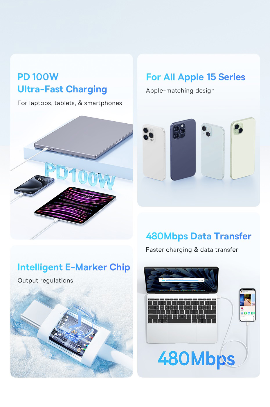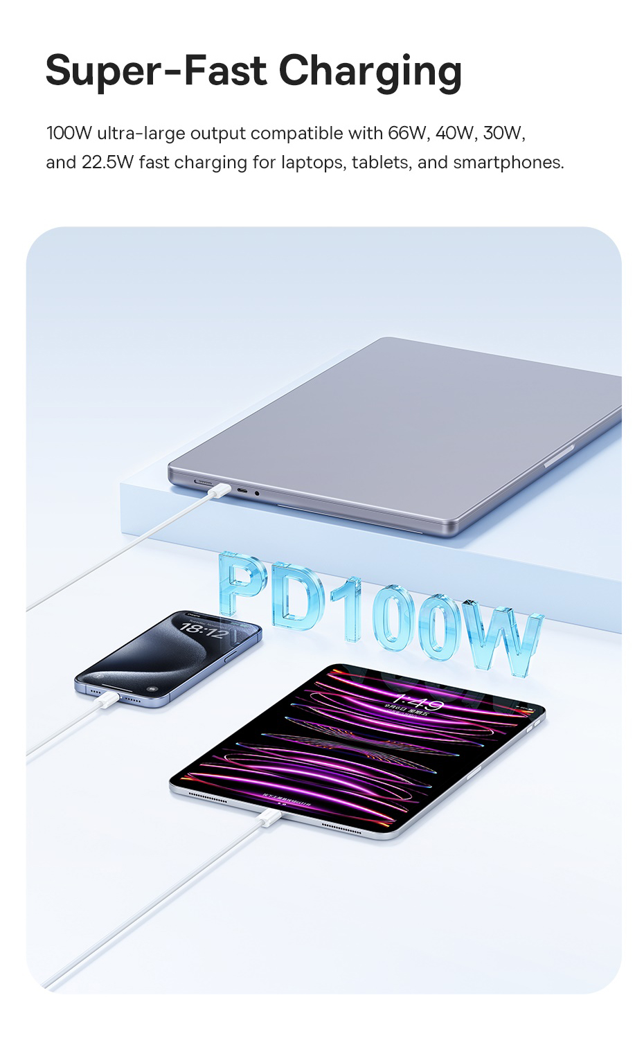 Tốc Độ Sạc Nhanh 100W: Với khả năng chuyển đổi công suất lên đến 100W, cáp này cung cấp sạc nhanh và hiệu quả cho các thiết bị sử dụng cổng Type-C, bao gồm laptop, điện thoại di động, máy tính bảng và nhiều thiết bị khác.