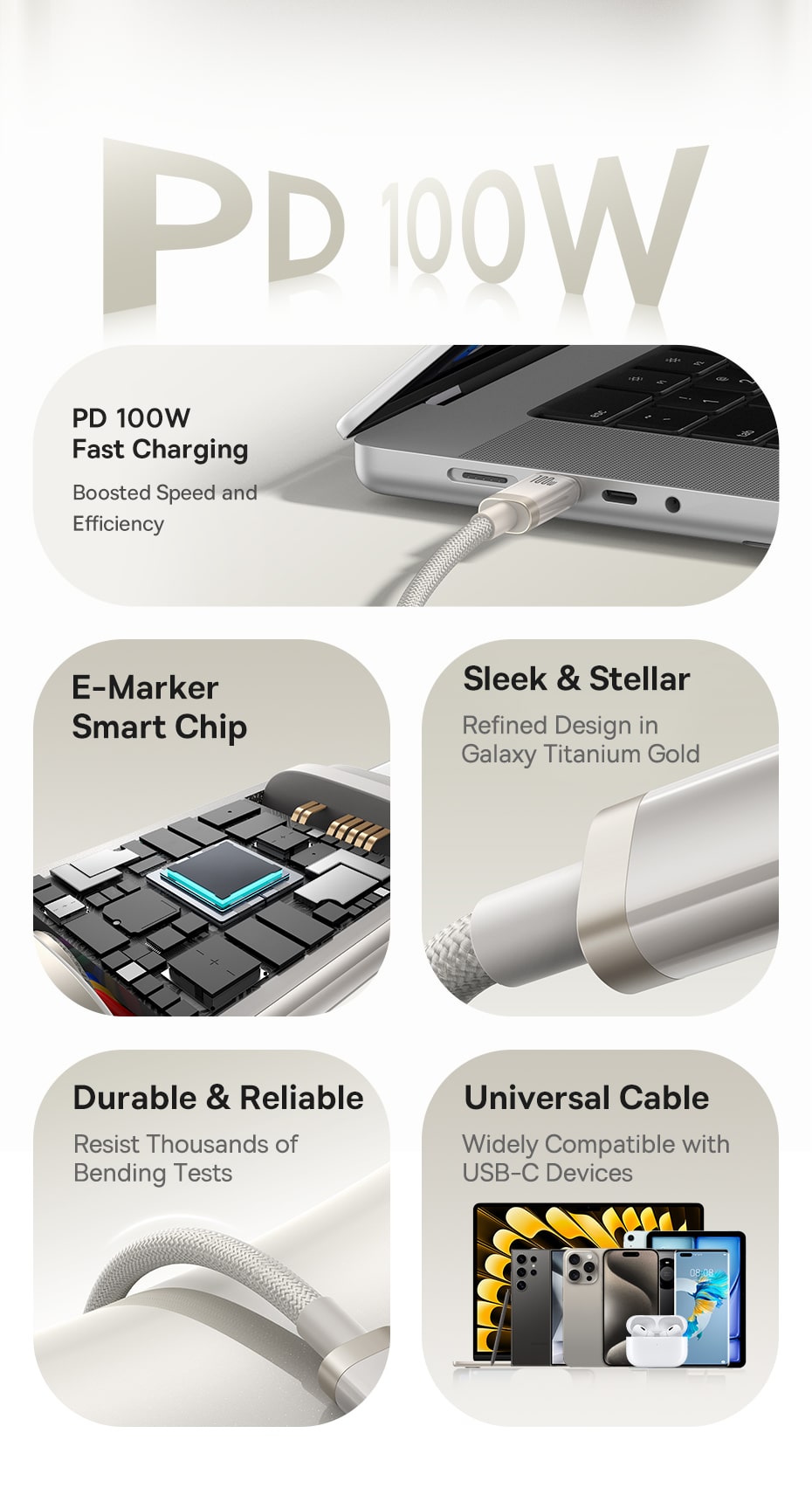 Nâng cấp trải nghiệm sạc của bạn với dòng cáp Baseus Titanium Alloy. Đây là sự kết hợp hoàn hảo giữa thiết kế kim loại tinh xảo, độ bền đã được kiểm chứng và công nghệ sạc thông minh, mang đến một phụ kiện vừa sang trọng vừa đáng tin cậy cho tất cả các thiết bị Type-C của bạn.