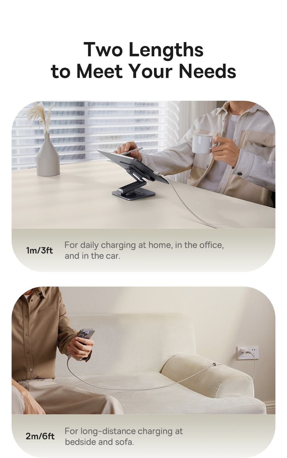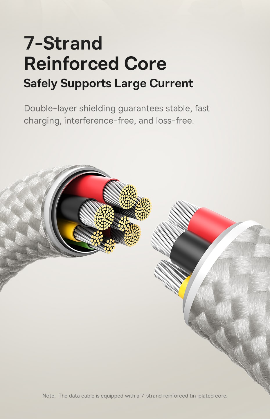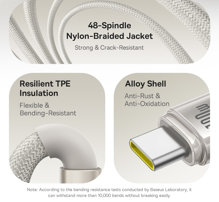 💪 Bền Bỉ Vượt Trội, Chống Đứt Gãy: Dây cáp được bọc dù bện từ 48 sợi nylon mật độ cao, kết hợp với cổ cáp được gia cố dẻo dai. Cấu trúc này đã vượt qua hơn 10,000 lần thử nghiệm uốn cong, đảm bảo độ bền vượt trội so với cáp thông thường.