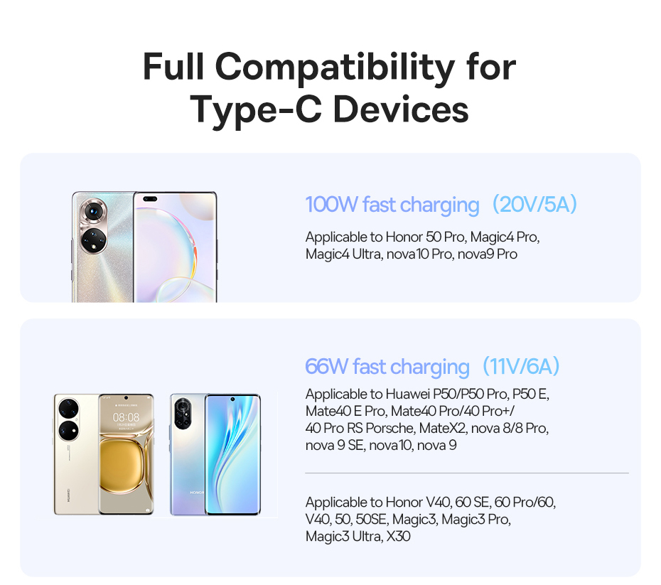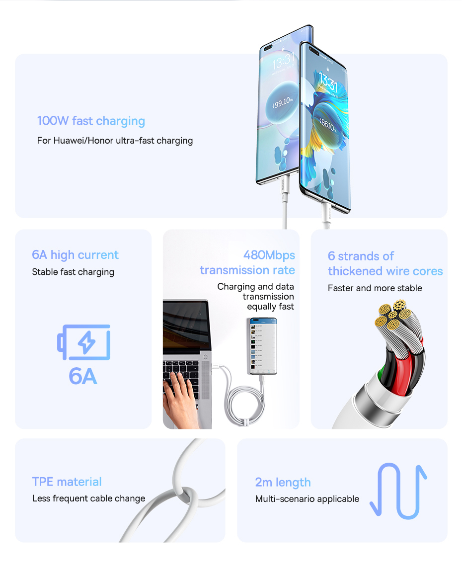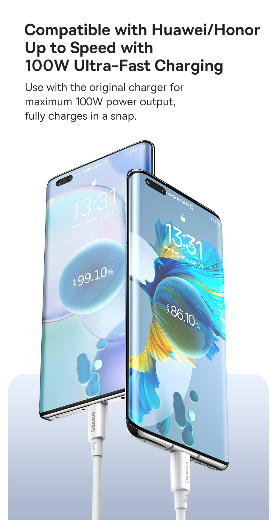 ○ Hỗ trợ sạc siêu nhanh 100W: Được thiết kế đặc biệt để tương thích hoàn hảo với các chuẩn sạc nhanh độc quyền 100W/66W/40W/22.5W của Huawei và Honor, cho tốc độ sạc tối đa mà các loại cáp thường không đạt được.