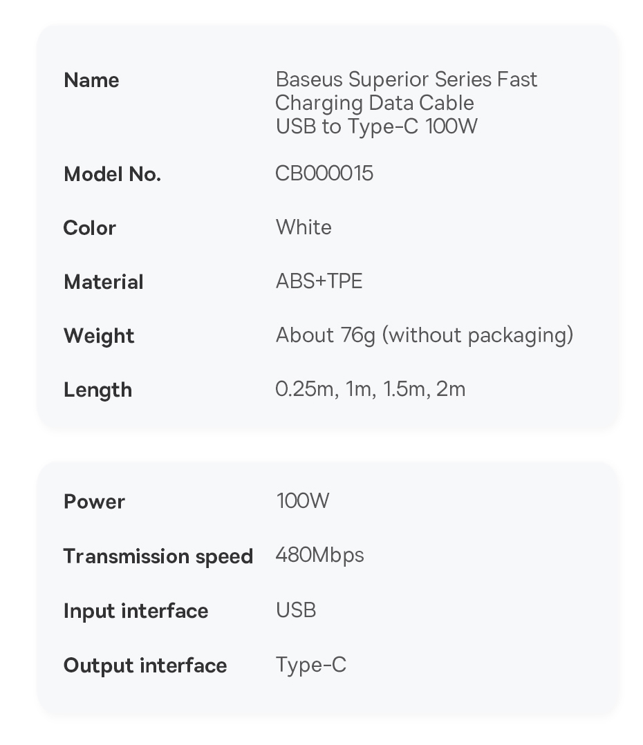 | Tên | Cáp Sạc Nhanh Type-C Baseus Superior Series Fast Charging Data Cable USB to Type-C 100W |