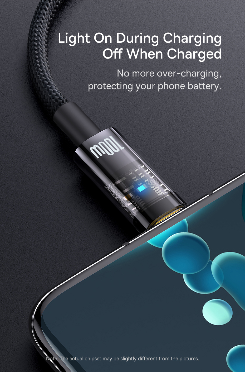 Sản phẩm được trang bị chip quản lý nguồn thế hệ mới với khả năng tự động nhận diện thiết bị, tình trạng pin trên điện thoại để có thể điều chỉnh dòng sạc và công suất sạc phù hợp với từng giai đoạn của quá trình sạc pin. Đặc biệt cáp sạc sẽ tự động ngắt hoàn toàn dòng sạc khi sạc đầy. Tính năng này giúp chống chay pin, phù pin, tối ưu tuổi thọ pin của thiết bị.