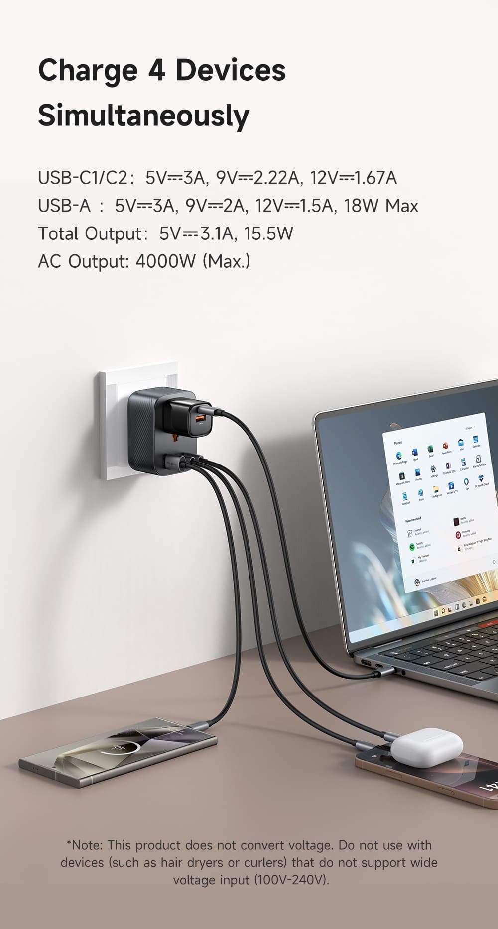○ Sạc 4 thiết bị cùng lúc: 1 qua ổ cắm AC, 3 qua 3 cổng sạc (1 USB, 2 Type-C).