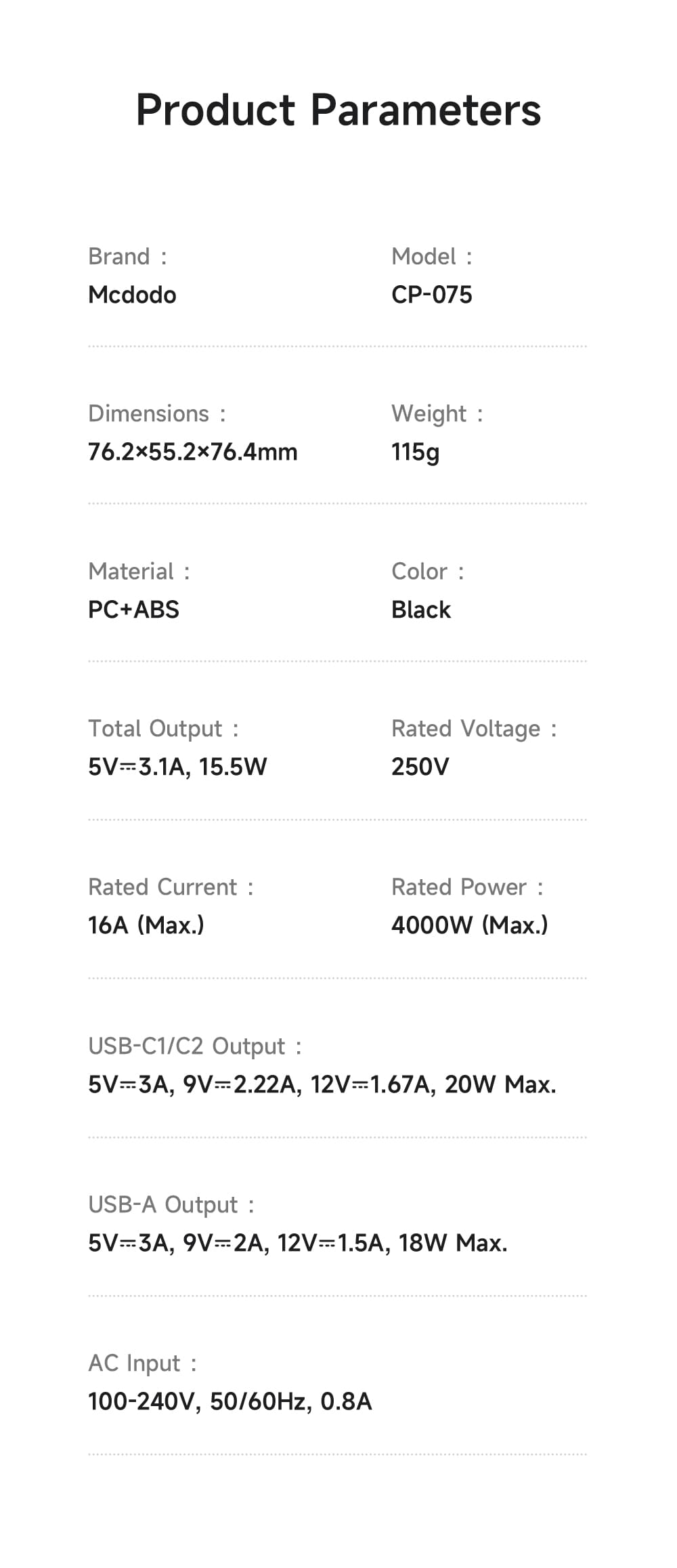 | Type-C1/C2 Output | 5V-3A, 9V-2.22A, 12V-1.67A 20W Max. |