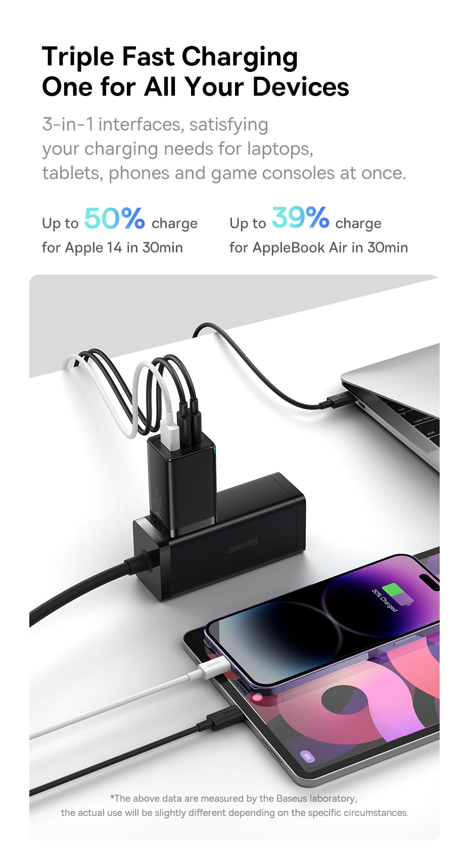 🧠 3 CỔNG SẠC THÔNG MINH BPS II: Sạc đồng thời 3 thiết bị một cách an toàn và hiệu quả. Công nghệ tự động phân chia công suất BPS II độc quyền của Baseus đảm bảo mỗi thiết bị được cấp nguồn tối ưu nhất mà không gây quá tải, bảo vệ an toàn tuyệt đối.