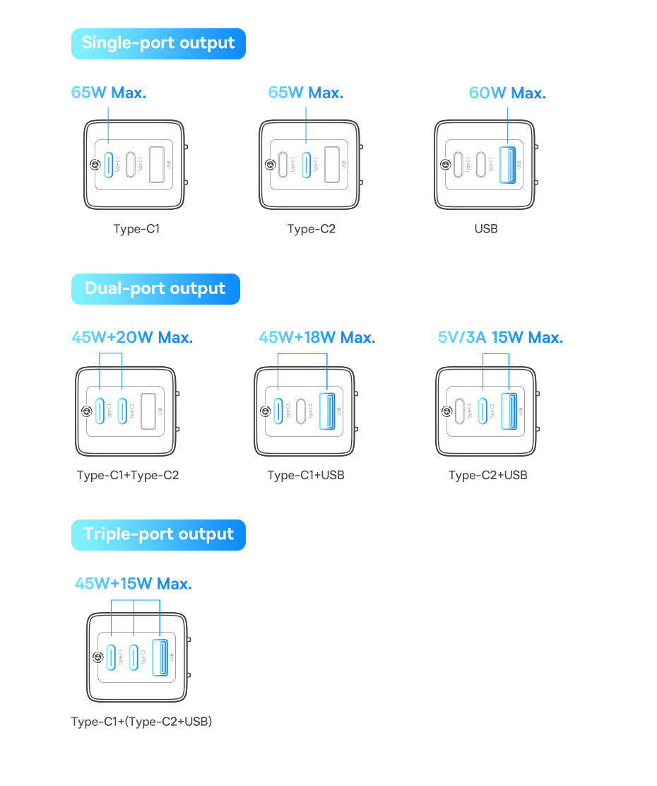 | Type-C1 + (Type-C2 + USB) Output | 45W + 15W |