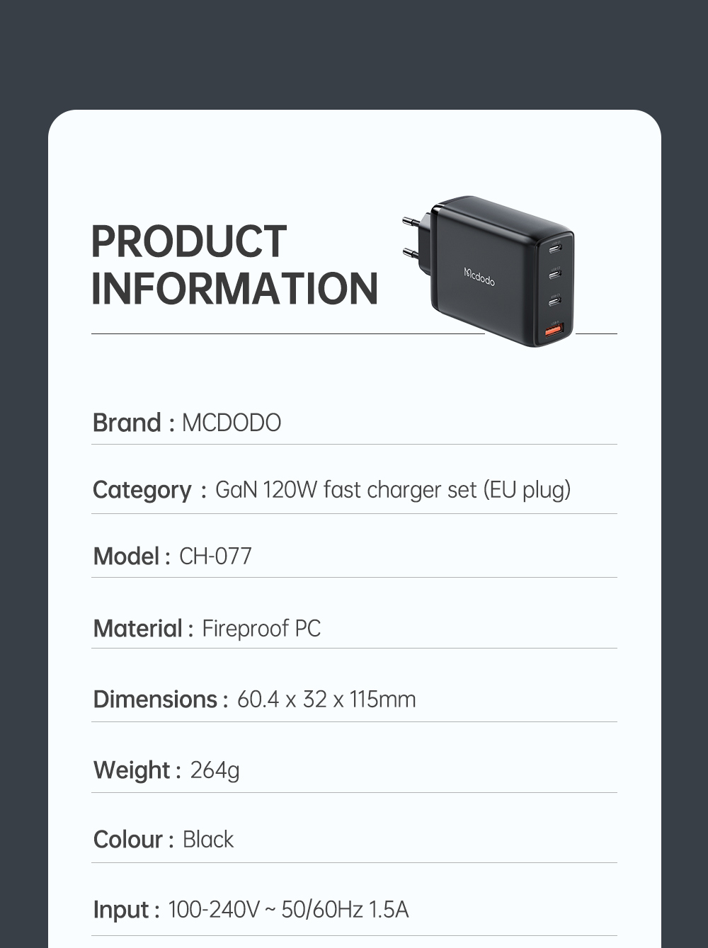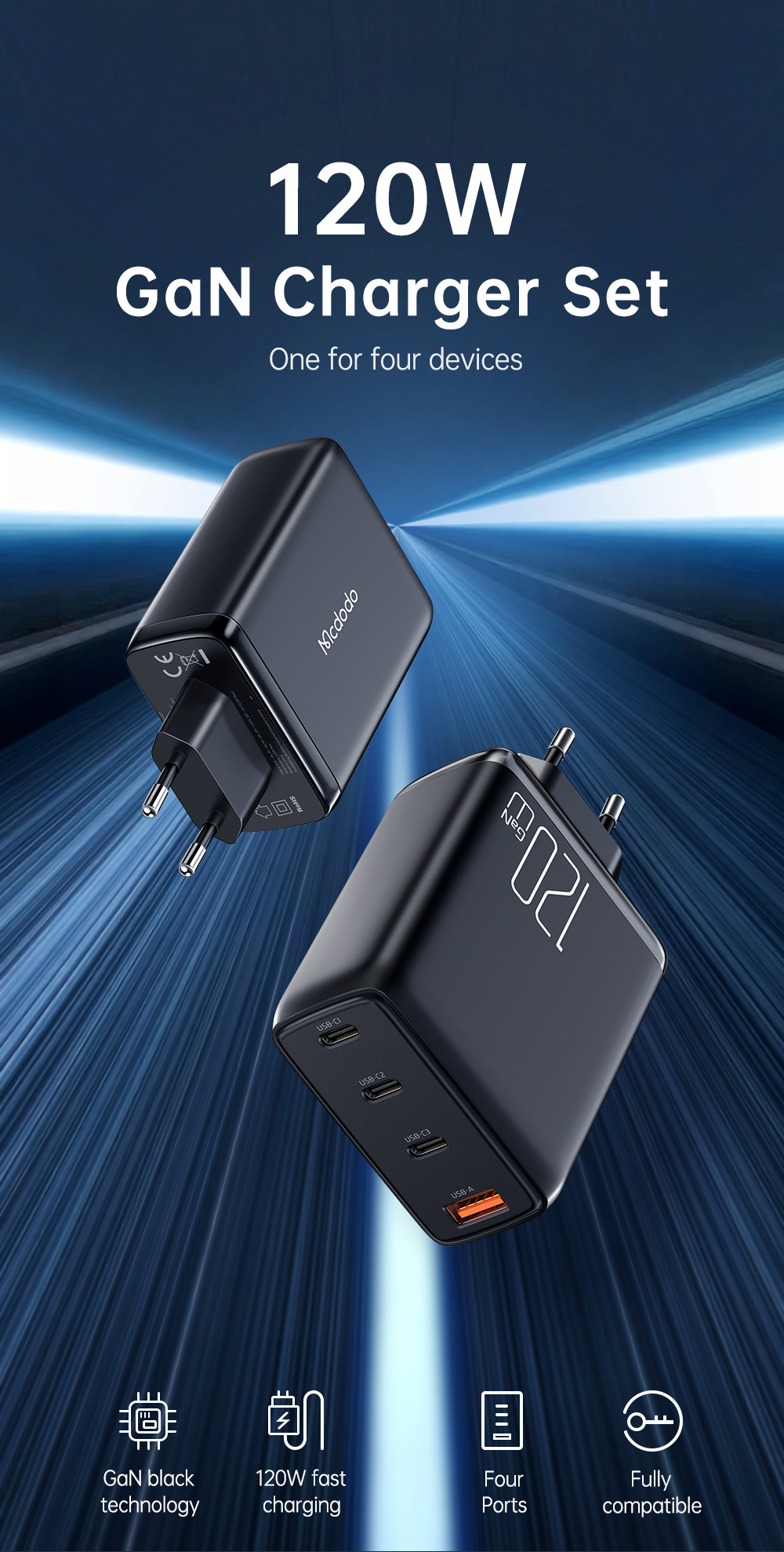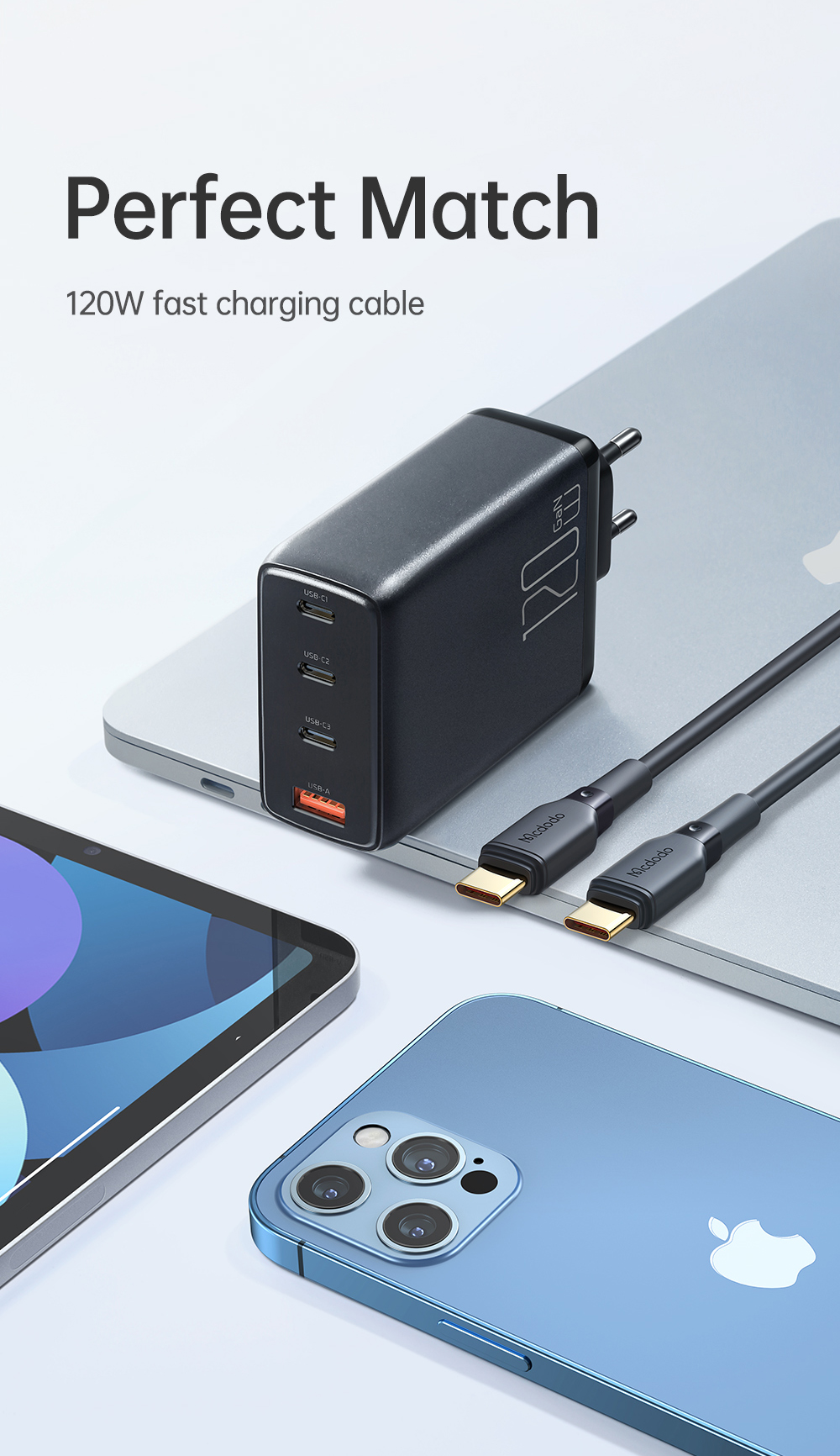 | Tên | Cốc Sạc Nhanh Mcdodo Convergence Series 120W GaN 4-Port Fast Charger Set (Kèm cáp C to C 2m, 100W, 3 TypeC + USB) |