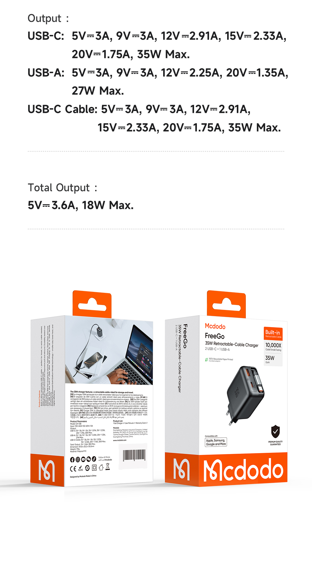 | Tên | Cốc Sạc Nhanh Mcdodo FreeGo 35W GaN | Tích Hợp Dây Rút Gọn Type-C, Sạc Cùng Lúc 3 Thiết Bị |