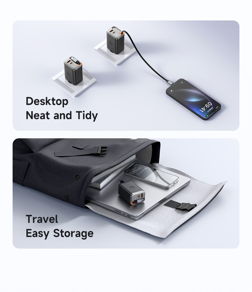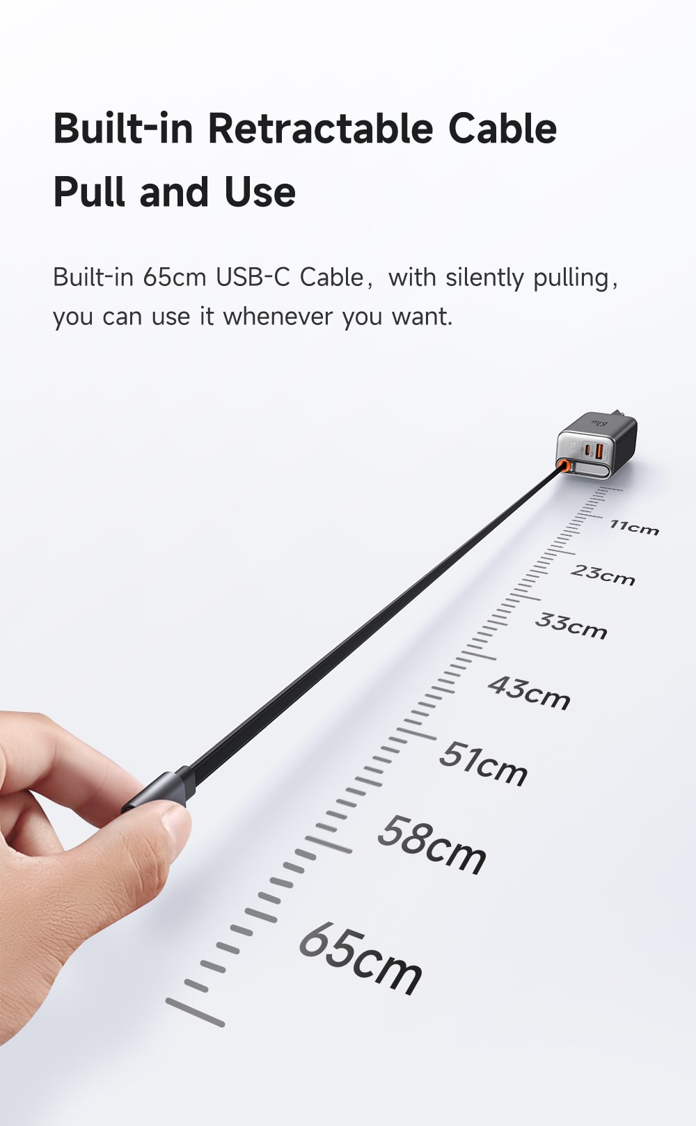 🔗 Tích Hợp Dây Sạc Type-C Tự Rút Gọn: Đây là tính năng nổi bật nhất! Nói lời tạm biệt với dây cáp rối! Sợi cáp sạc nhanh Type-C được tích hợp ngay trong thân củ sạc và có thể kéo dài ra khi cần. Sau khi dùng xong, chỉ cần bấm nút, cáp sẽ tự động rút gọn lại.