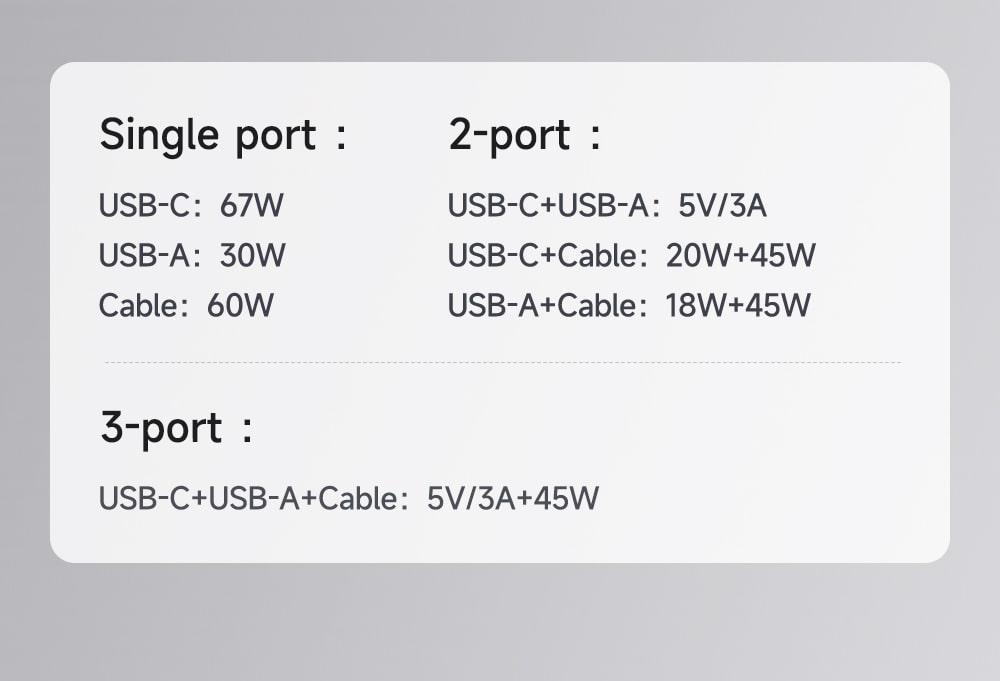 | Type-C Output | 5V-3A, 9V-3A, 12V-3A, 15V-3A, 20V-3.35A, 67W |