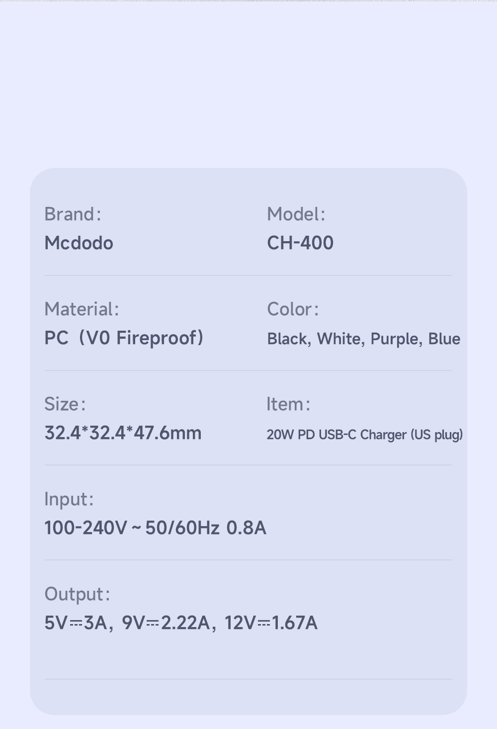 | Tên | Cốc Sạc Nhanh Mcdodo Nano Series 20W PD Charger (Chân dẹp CN) |