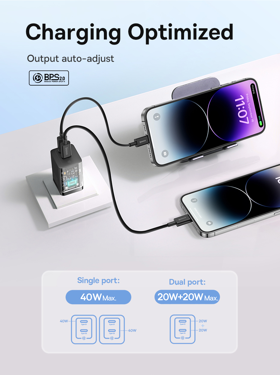 Tổng công suất 40W: Có thể sạc nhanh 2 thiết bị cùng lúc (20W+20W).