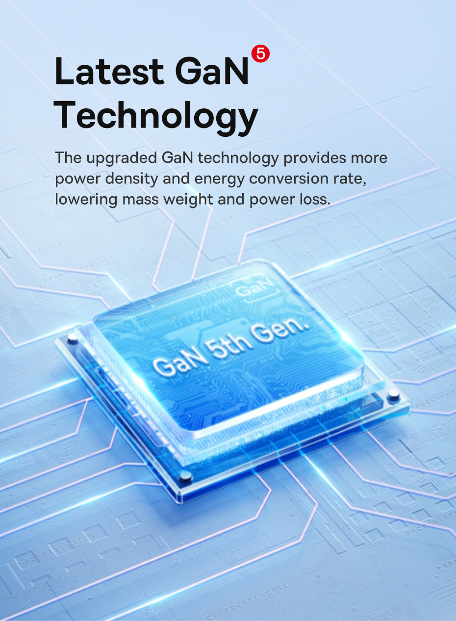 Công nghệ GaN5 Pro thế hệ mới: Giúp củ sạc có kích thước nhỏ hơn, hoạt động mát hơn và hiệu quả hơn.