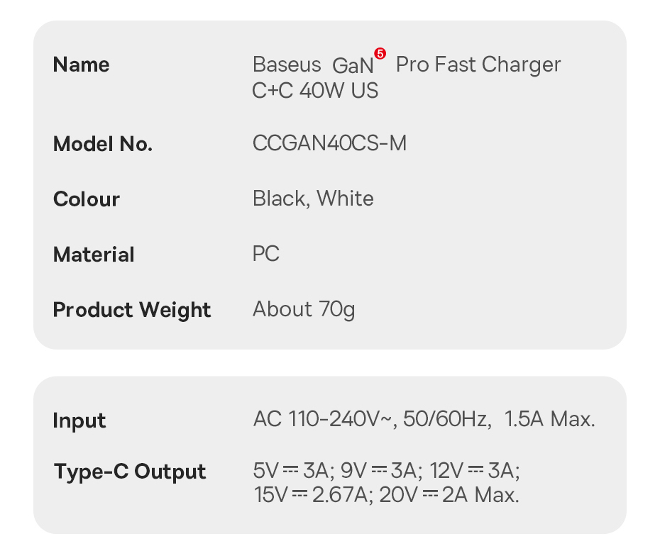 | Tên | Cốc Sạc Nhanh Nhỏ Gọn OS-Baseus GaN5 Pro Fast Charger C+C 40W US (Chân cắm dẹp US) |