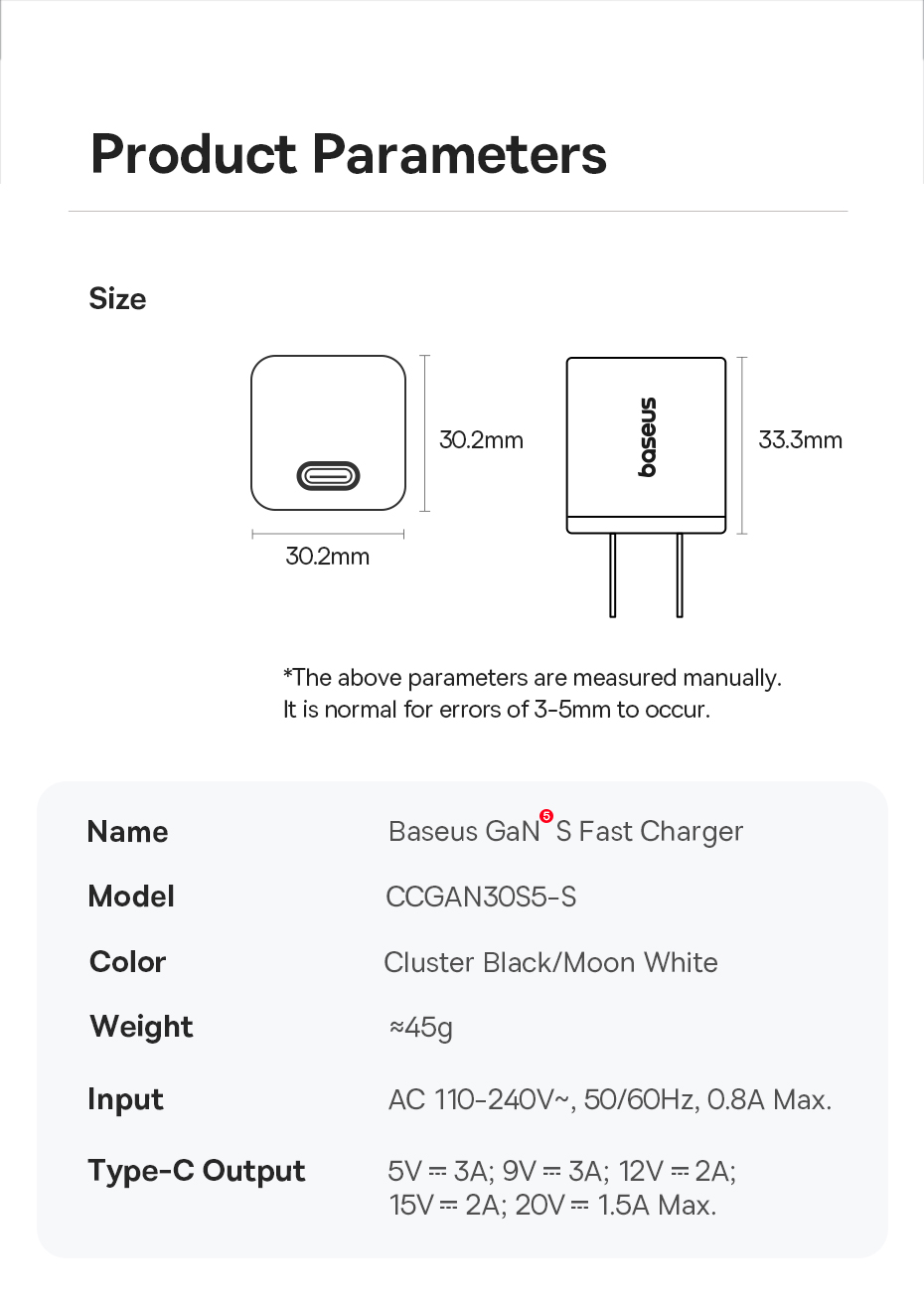 | Tên | Cốc Sạc nhanh OS-Baseus GaN5S Fast Charger 1C 30W (Chân dẹp US) |